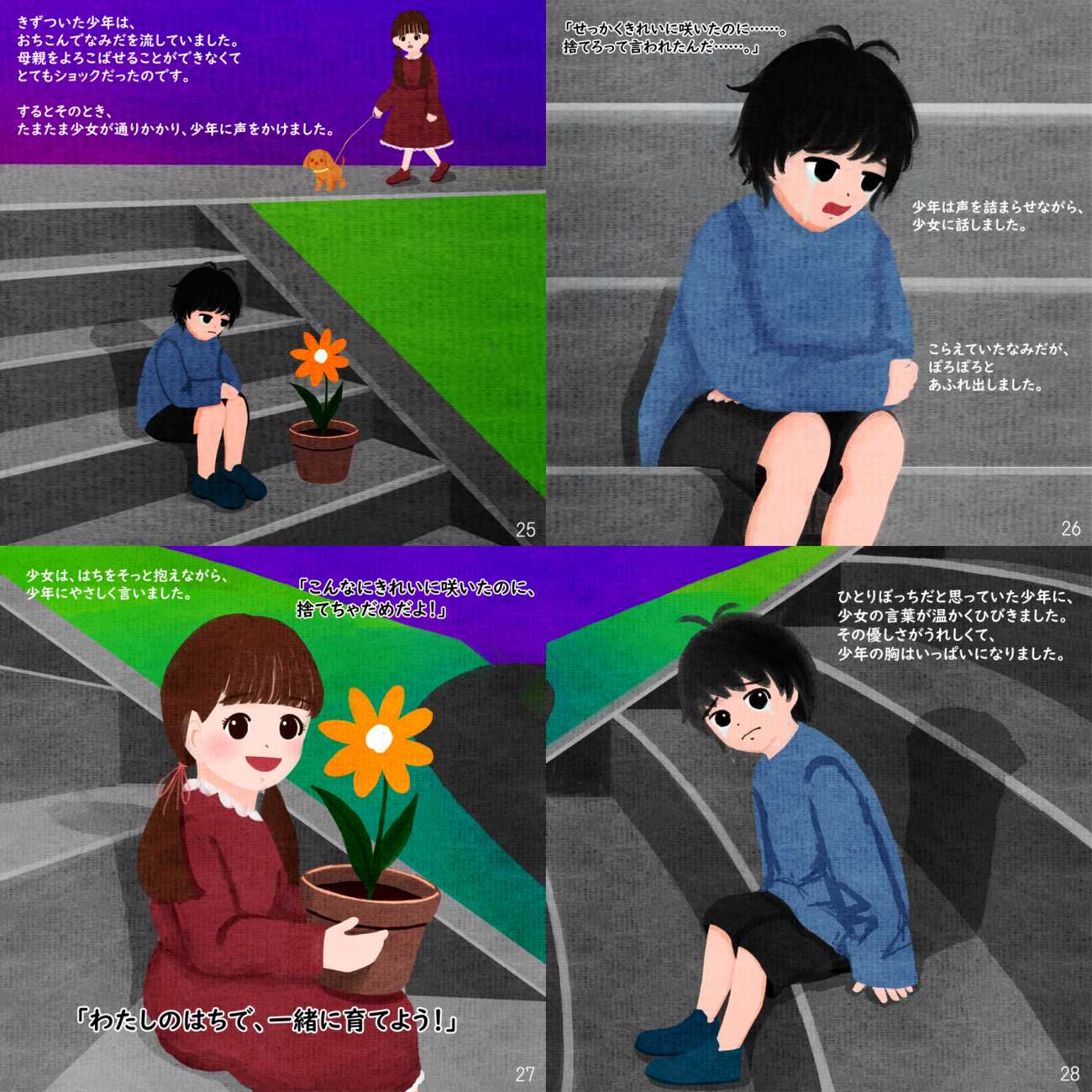 『良い環境が良い心を育てる』をテーマに、一輪の花との出会いをきっかけとして、孤独な少年が自分の居場所を見つけていく物語です。