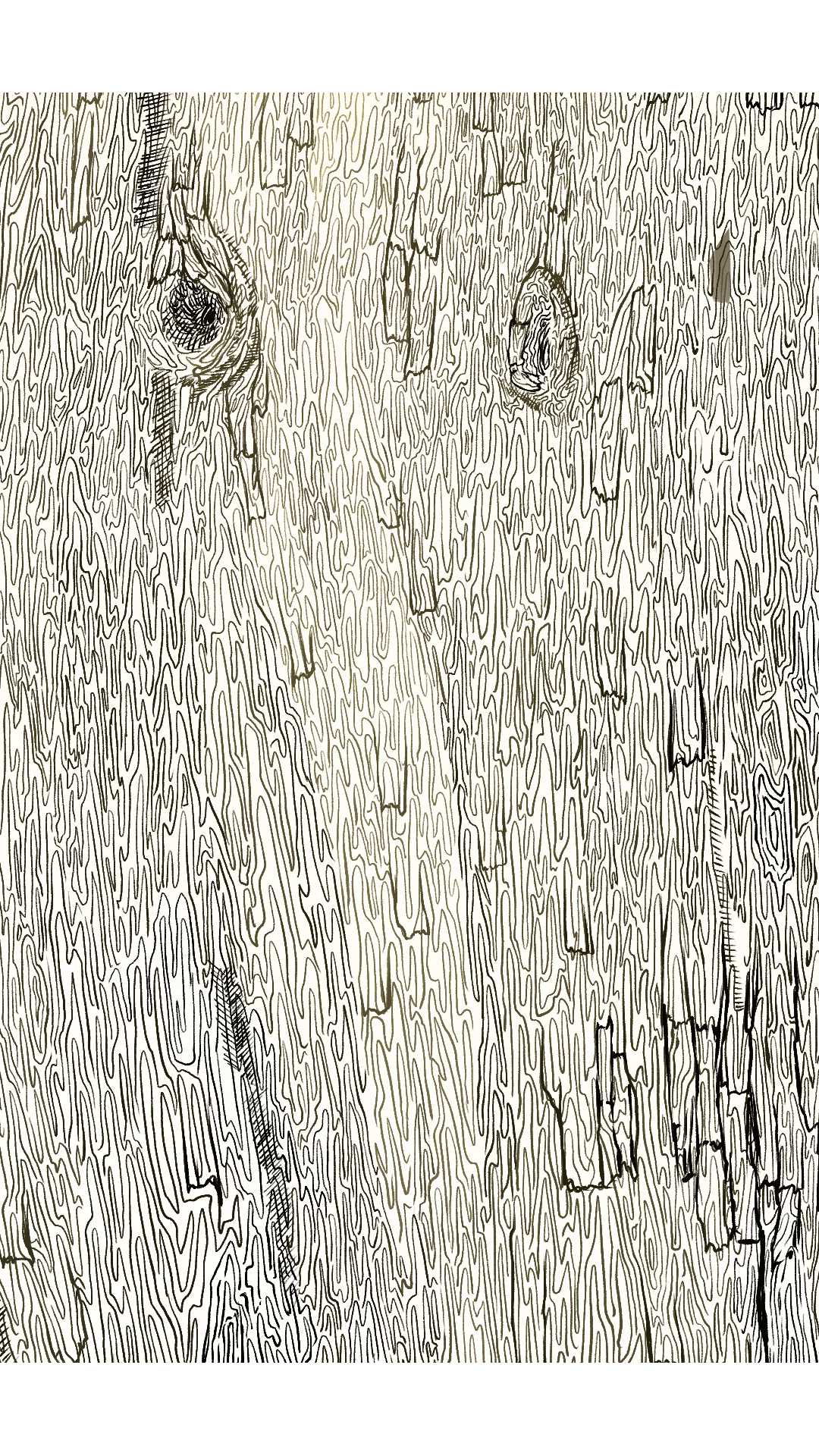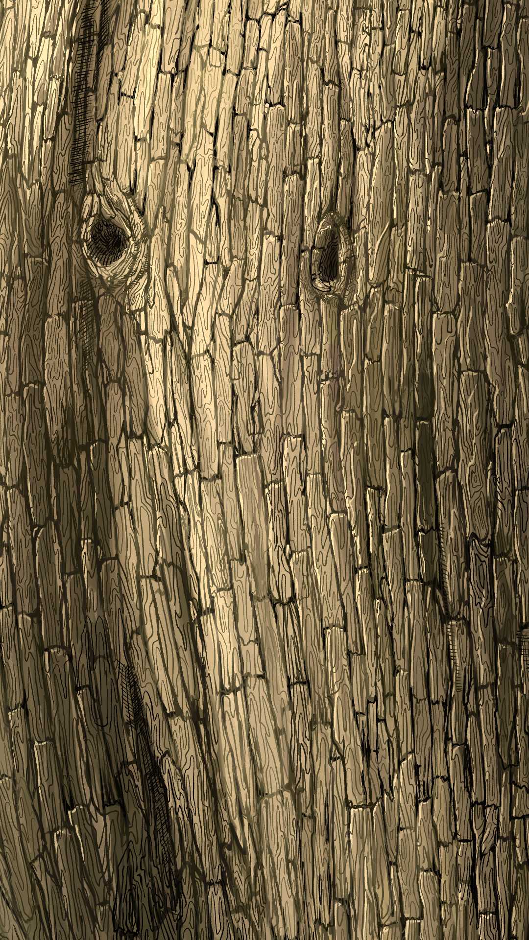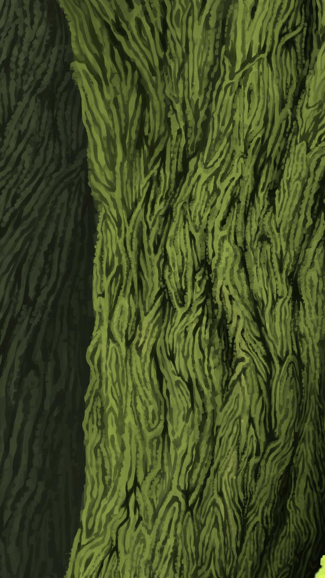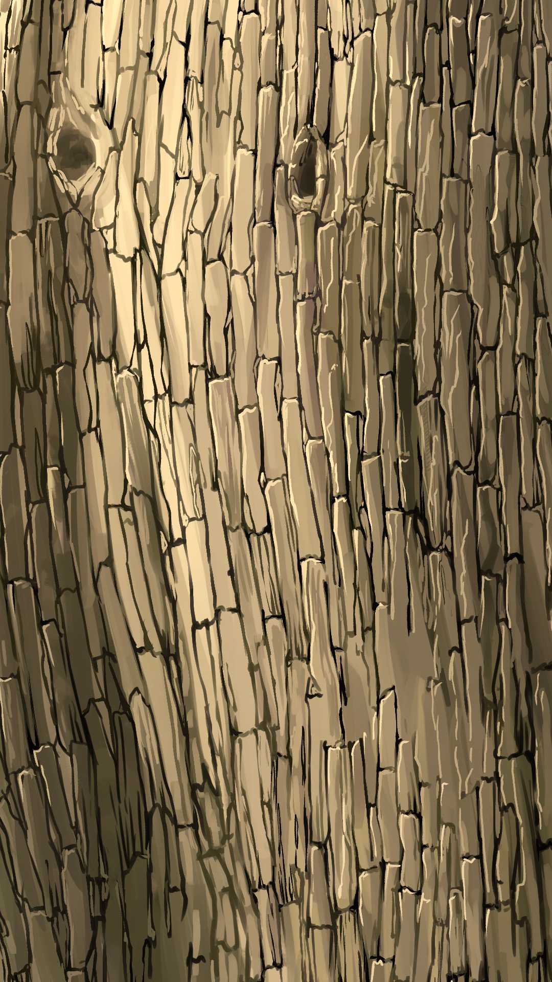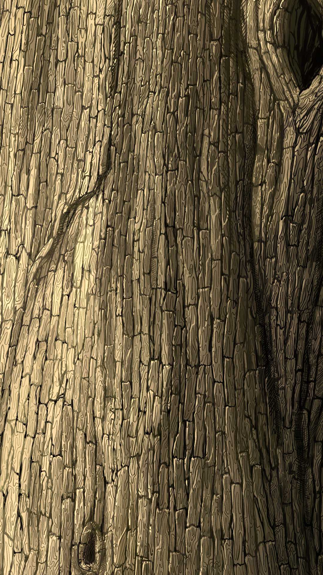 大樹の塗りのみの画像。大きめの割れ目と明るい色をその割れ目に沿って入れることで、樹皮1つ1つの立体感を強調している。