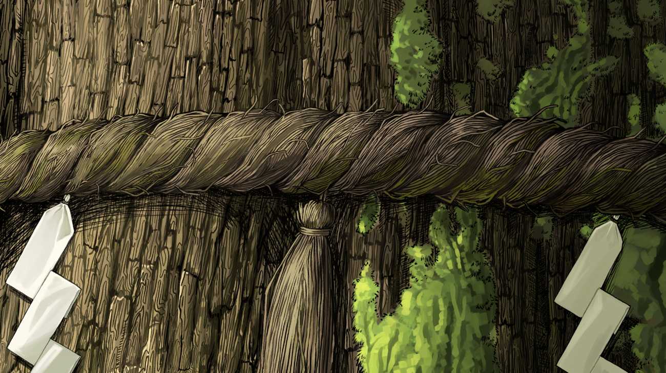 しめ縄の画像。大樹に力強さや神聖な印象を持ってほしいと思い、しめ縄を描いた。藁を1本ずつ描き大樹に負けない緻密な描写で表現している。