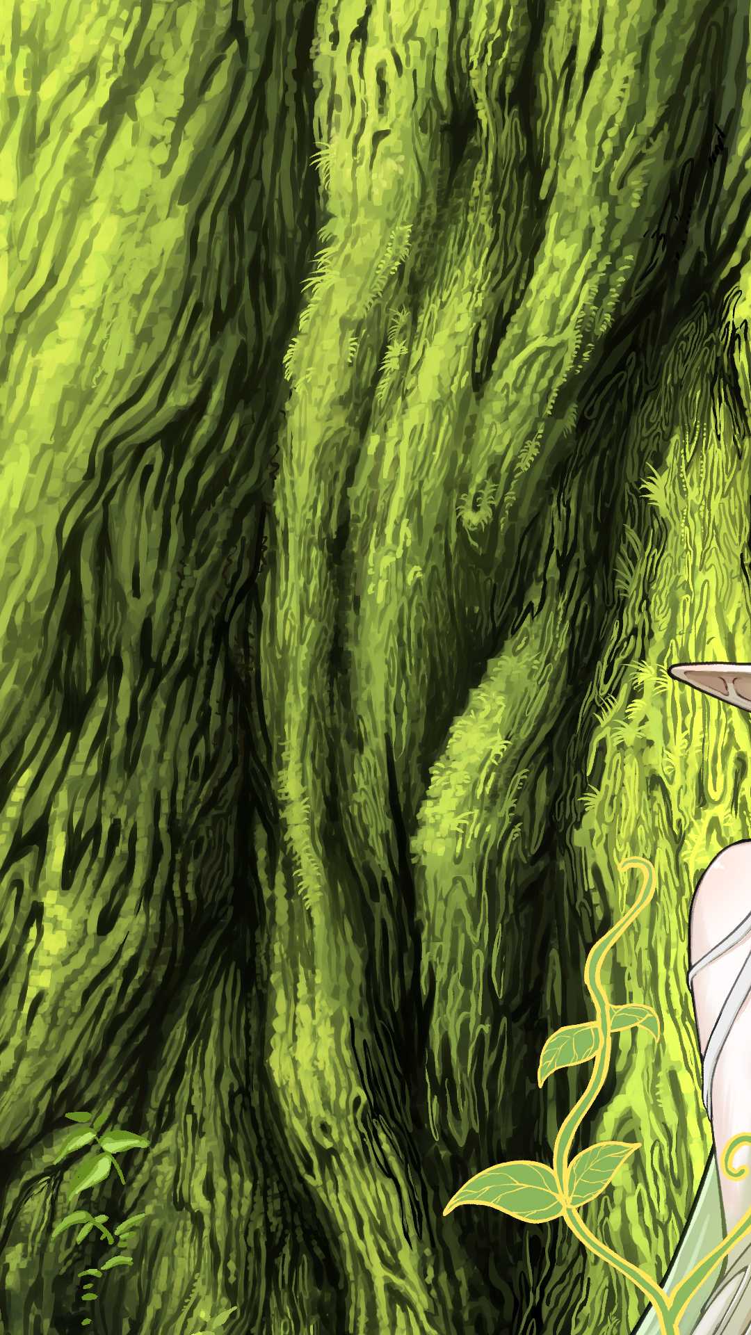 大樹の画像2枚目。線と塗りが合わさった表現は手前にあるメインの大樹のみに行っている。
