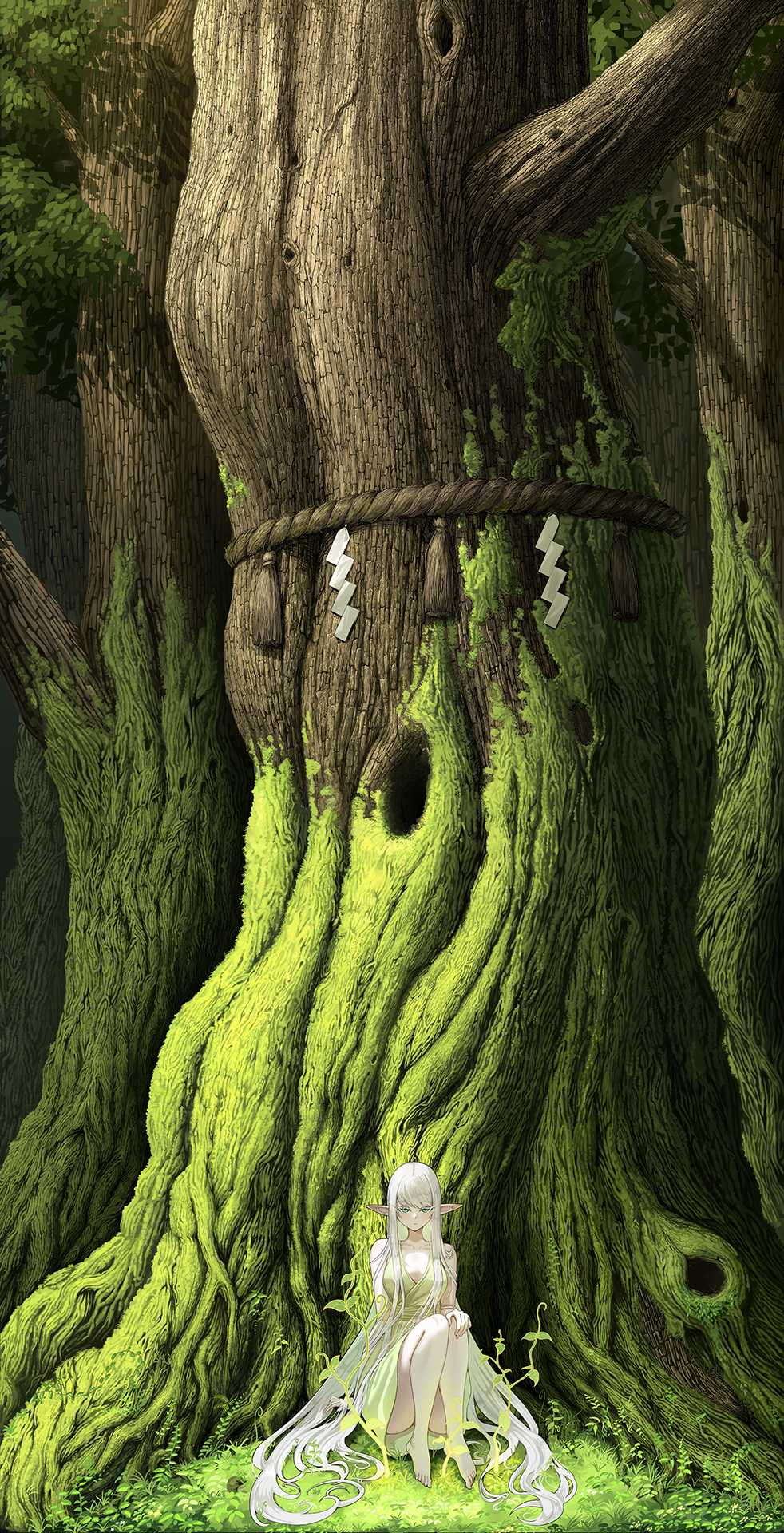 また、苔の表現は実際の苔とはかけ離れた描写方法で表現している。理由として、樹皮部分と同じくらいの緻密な描写でないと絵力に差ができてしまい、大樹のインパクトが欠けてしまうと考えたからである。この表現方法はジブリの背景画集にて樹木の一部分に施されており、樹木らしさを損なわずに情報量を上げることができると思いこの表現で制作している。またしめ縄や妖精も大樹に注目を集めるために配置したモチーフである。