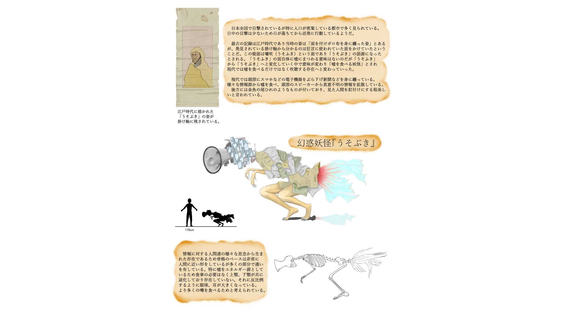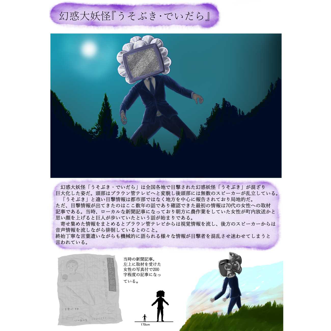 この作品は「もし現代の日本に妖怪がいたら」というコンセプトで制作しました。図鑑という形式を選んだ理由は、イラストで想像してもらいながら文章で補足出来ると考えたからです。また、観た人それぞれの考える(想像する)余白が残せるのではないかとも考えました。