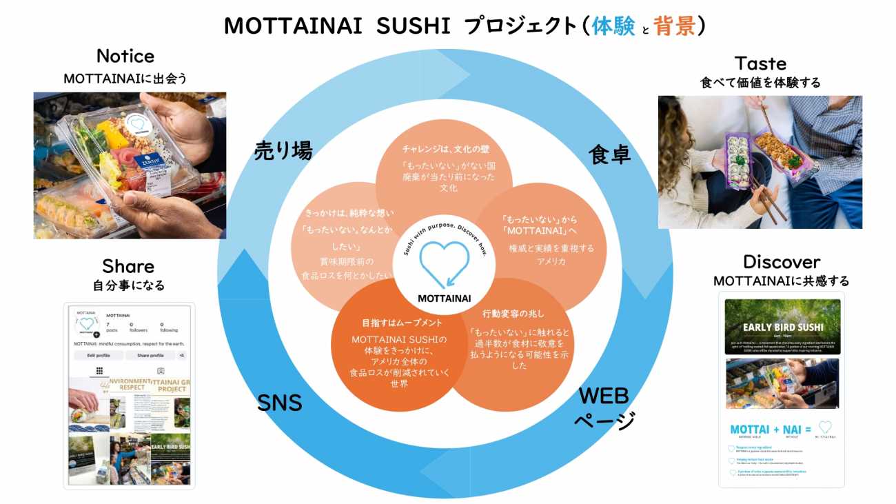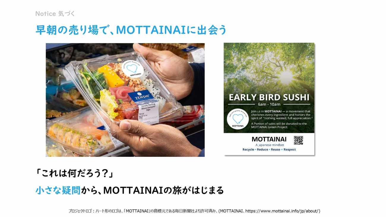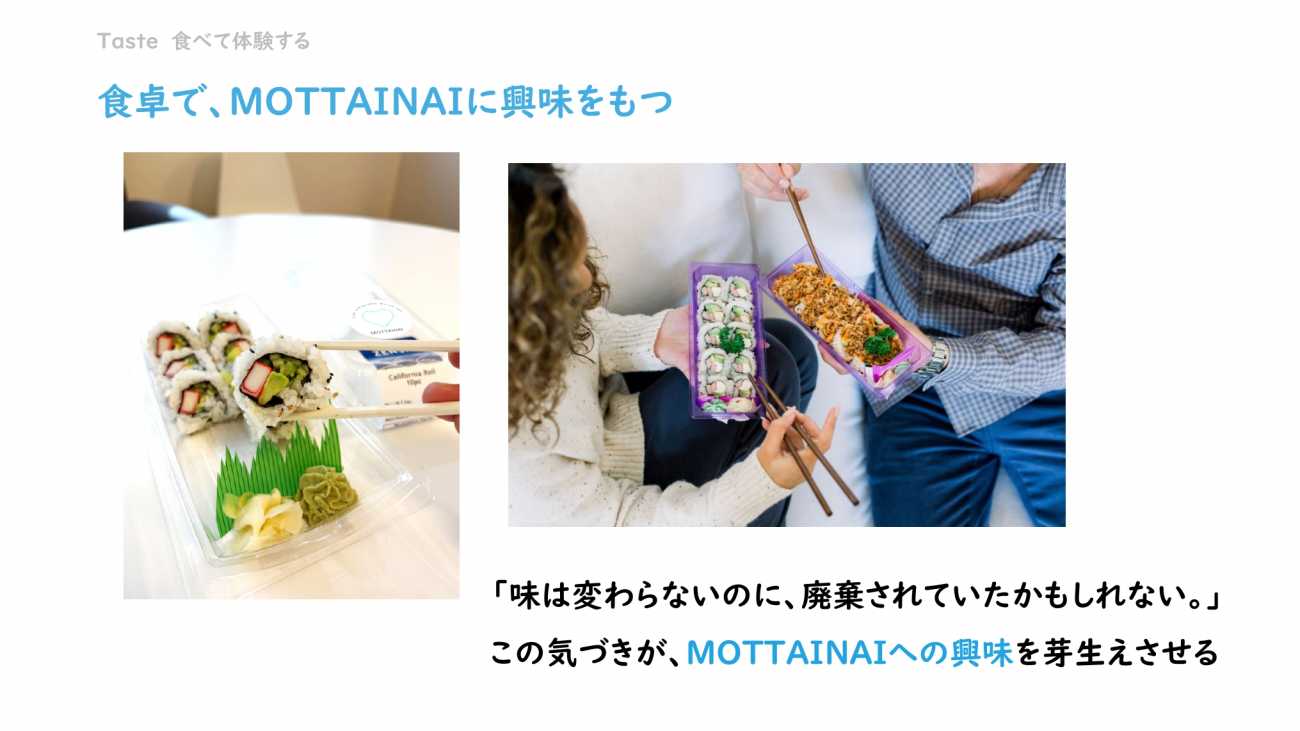 MOTTAINAIプロジェクトは、これらの商品に、「もったいない」という日本のソフトパワーの価値を与えることで、食を敬う気持ちを持ってもらい、食品ロスの削減を目指すプロジェクトです。