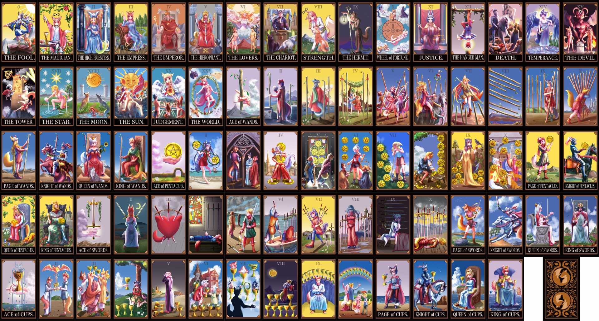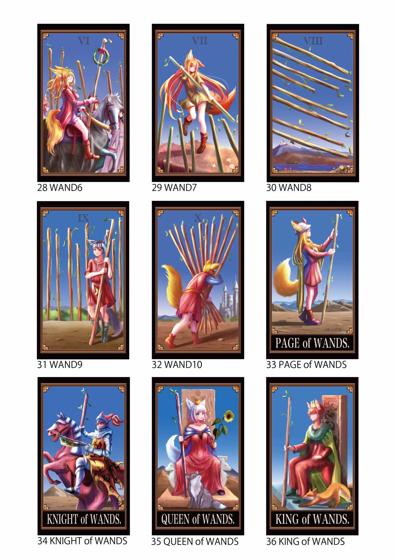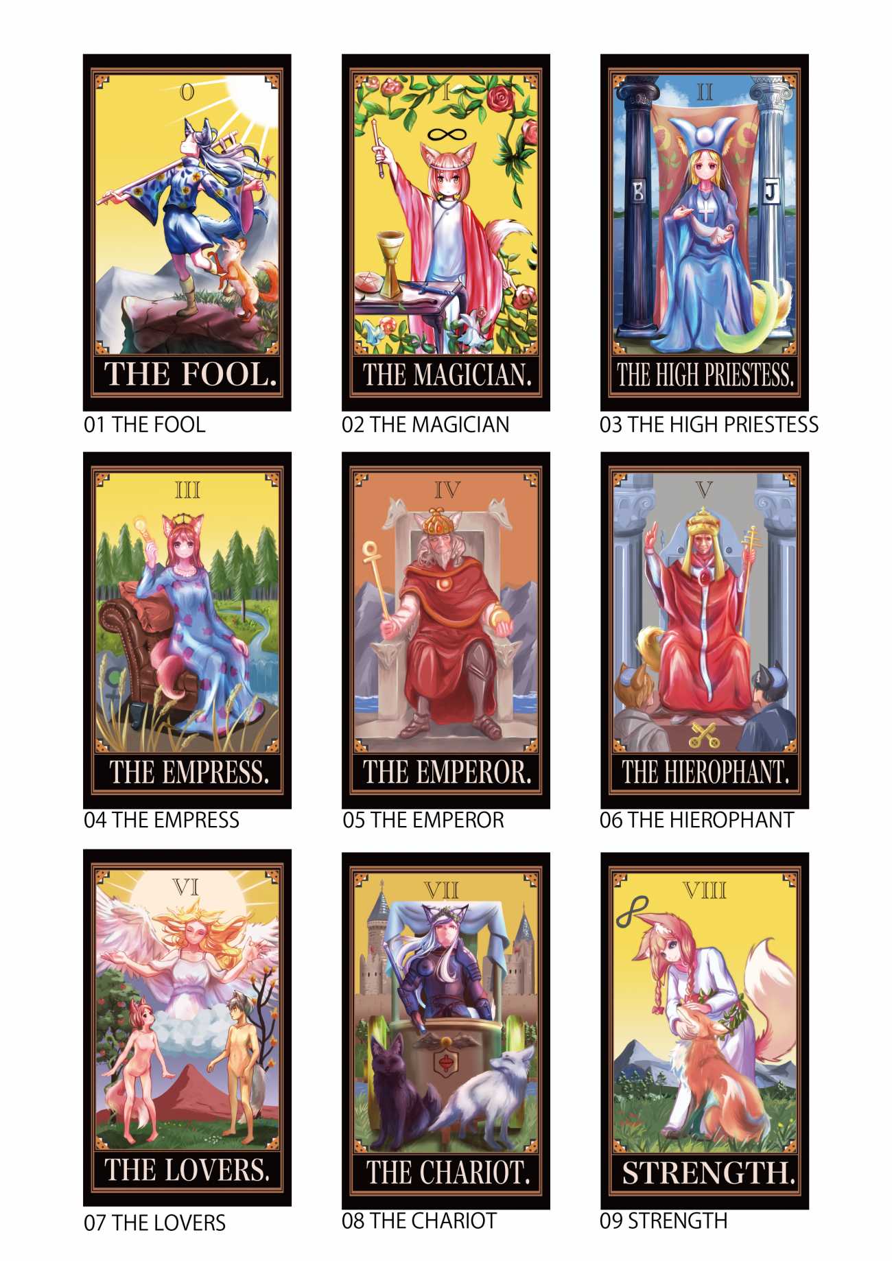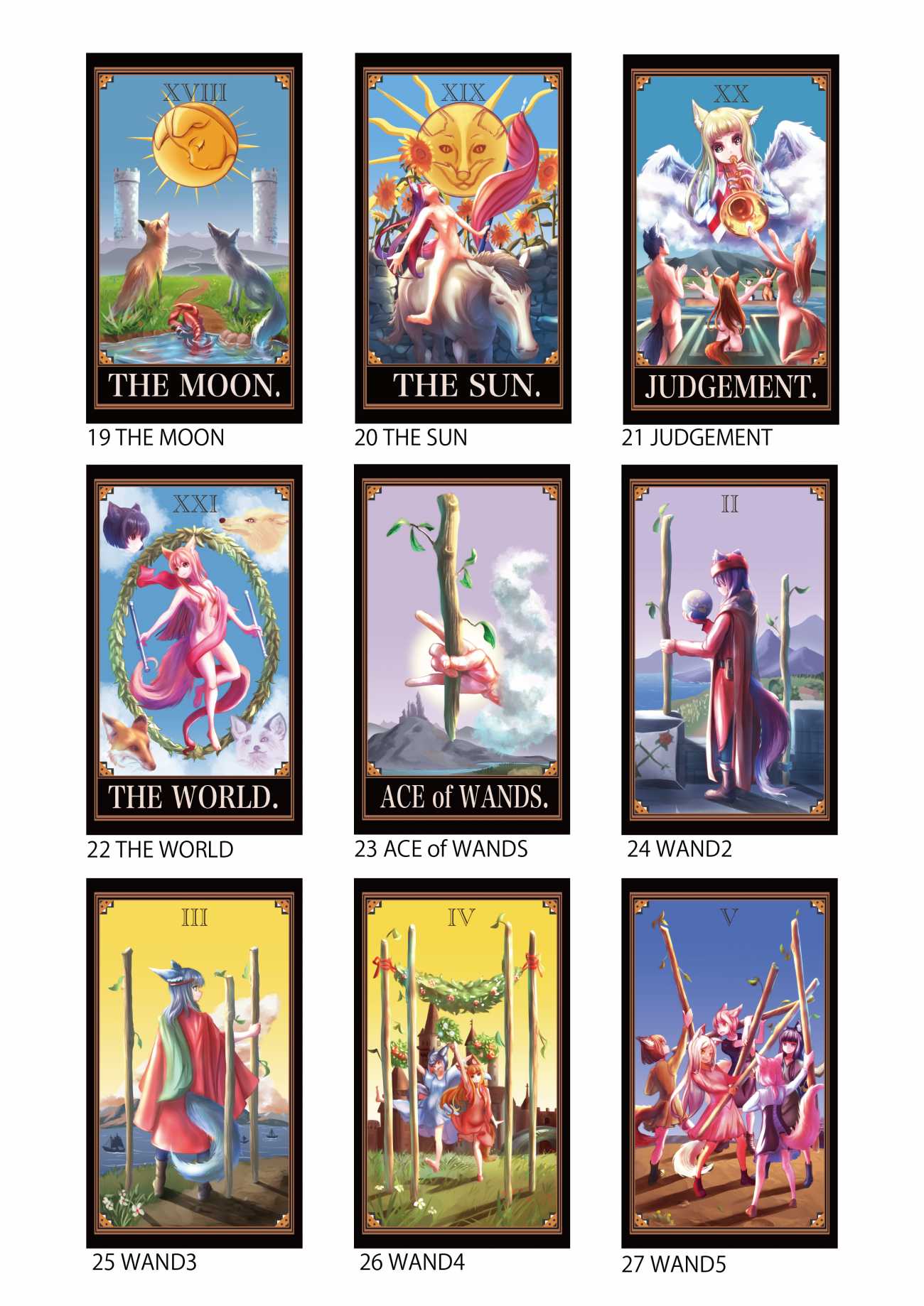 可愛らしいキツネ耳や尻尾を生やした人型の登場人物達をモチーフとしていて、初心者~上級者でも遊べる実用的で可愛いらしいタロットカードを作成する。