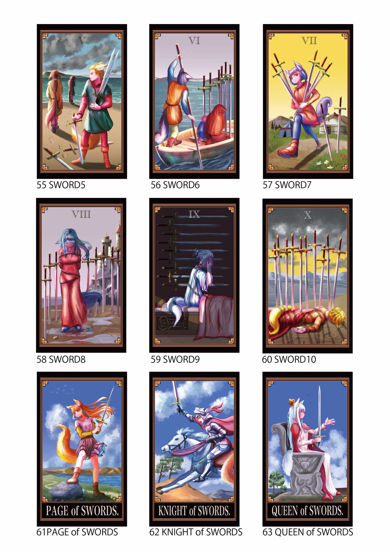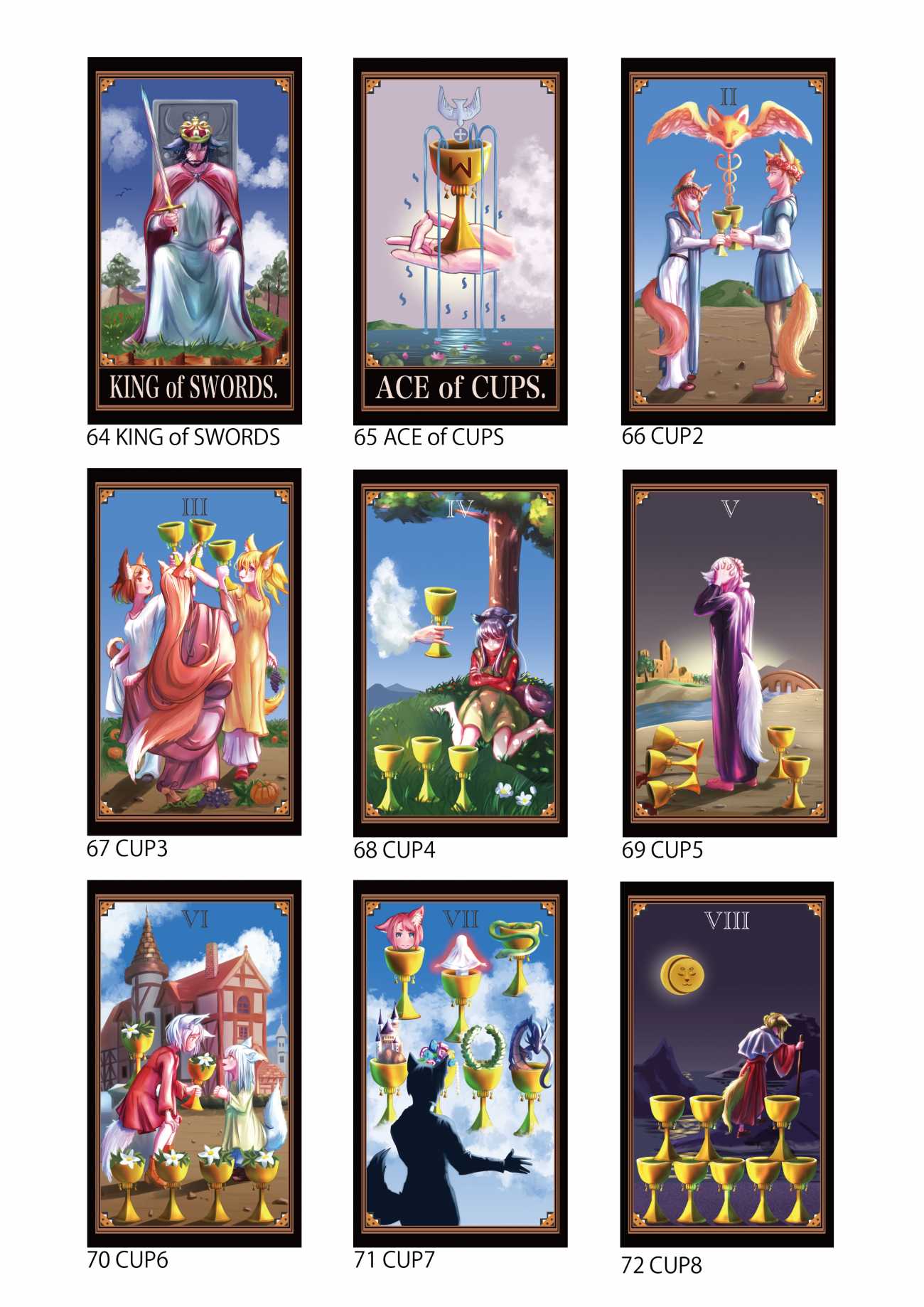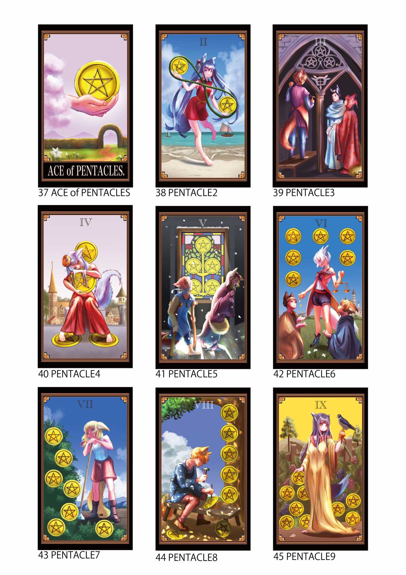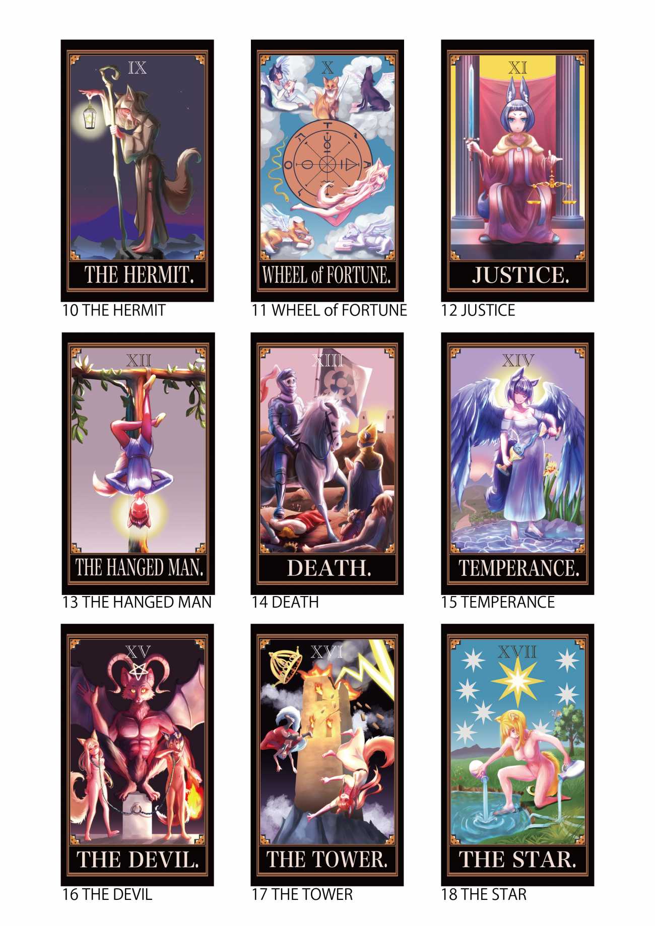 可愛らしいキツネ耳や尻尾を生やした人型の登場人物達をモチーフとしていて、初心者~上級者でも遊べる実用的で可愛いらしいタロットカードを作成する。