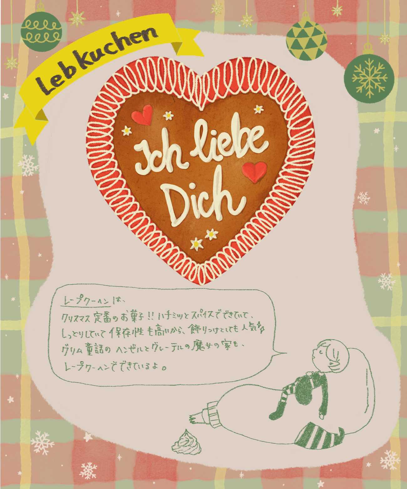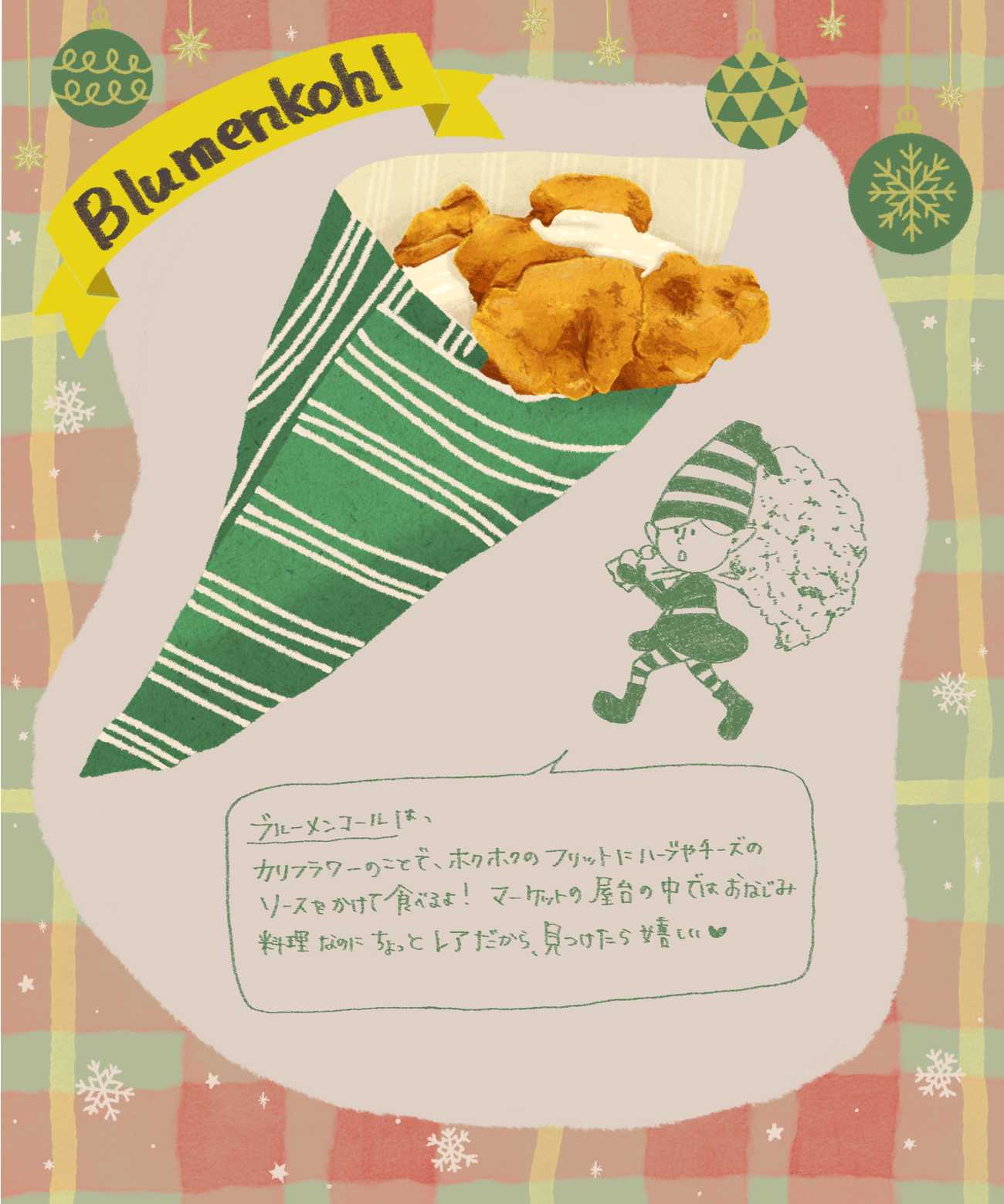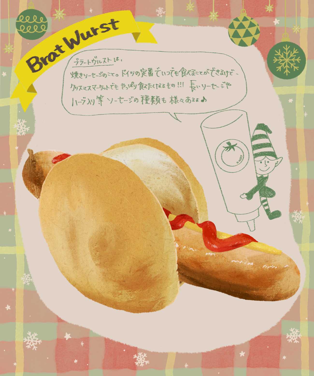 今回のイラストの制作で、クリスマスマーケットのワクワクや楽しさをより多くの人が知り、より親しみを持てるようにしていきたいと思っている。そして自身のイラスト制作において、人々がつくった「想い」の込められた食べ物たちを、イラストをつくることを通じて様々な想いを繋いでいきたいと思う。その食べ物を作った人の想いを始め、伝統料理を伝えていく想い、行事を祝う想い、美味しさや楽しさの幸せを分かち合おうとする想い等を、また別の誰かへと、ゆるやかな多幸感が感じられるイラストと共に繋いでいくことが出来たら良いと思う。