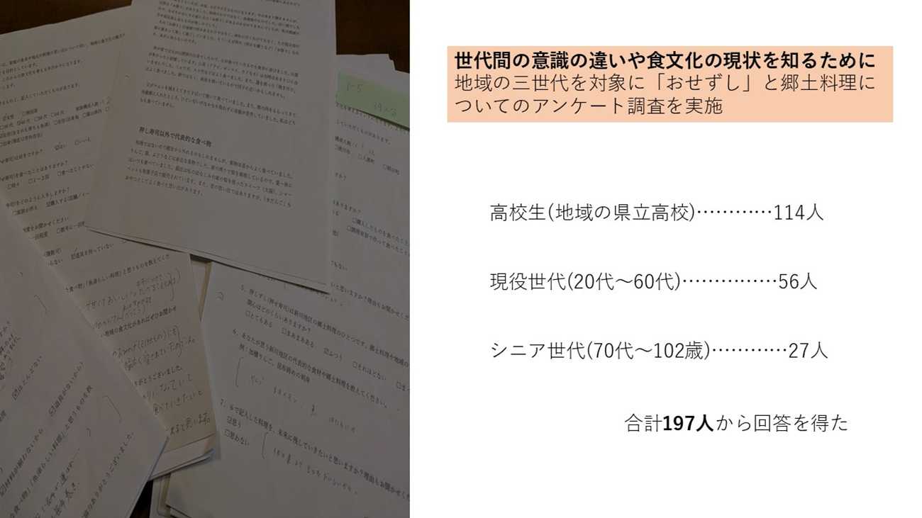 「おせずし」の状況を知るために、新川地区に暮らす三世代を対象としたアンケート調査を行い、食文化の現状や世代ごとの意識を明らかにしました。