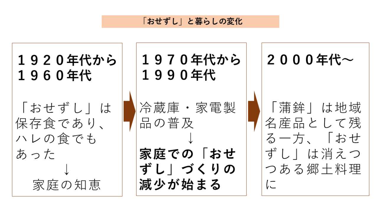 家電製品の普及と「おせずし」の変遷を重ねてみることで、シニア世代と現役世代の間で継承が途絶えつつある現状がより明らかになりました。