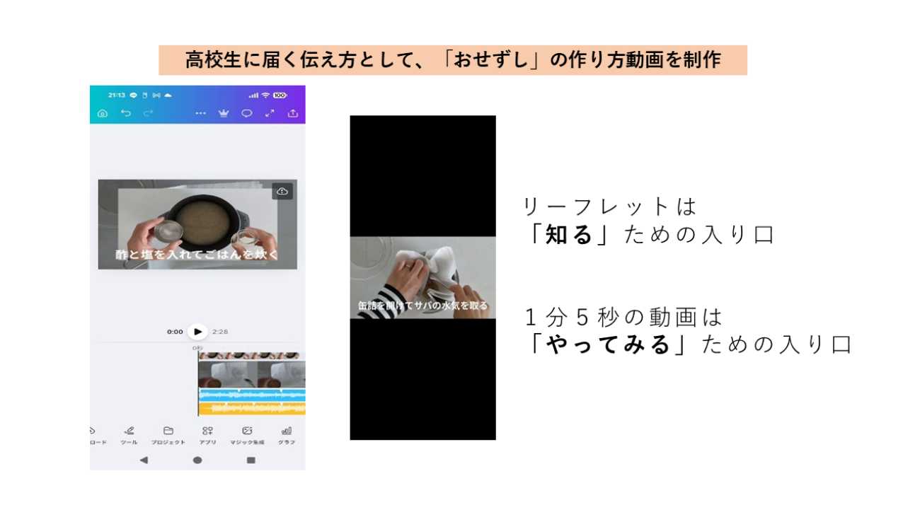 さらに、教員から高校生は動画への関心が高いとの情報を得たことから、「おせずしの作り方」動画を制作しました。