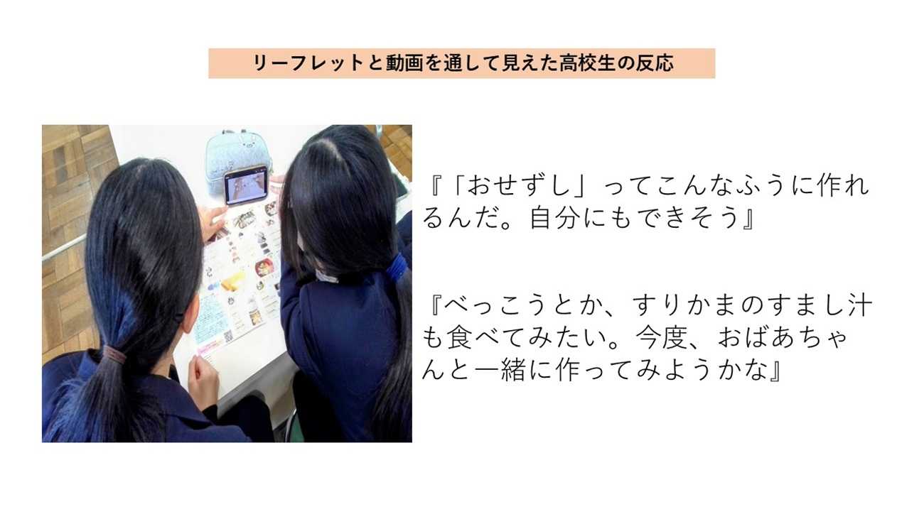 リーフレットと動画を見た高校生からは、「おせずしって、こんなふうに作れるんだ。自分にもできそう」、「べっこうや、すり身のすまし汁を食べてみたい。今度、おばあちゃんと一緒に作ってみようかな」という声が聞かれました。