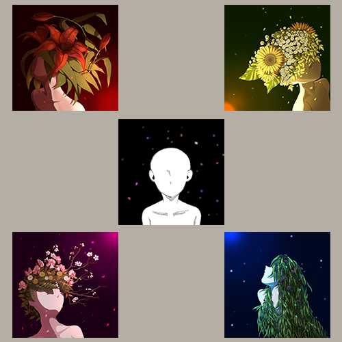 画面では、人物を小さく配置し、その周囲を何重にも重なった花で囲んだ。花は美しさや華やかさの象徴であると同時に、社会や他者、あるいは世界そのものの圧力を表している。象徴主義の画家オディロン・ルドンに影響を受け、花に「目」を持たせることで、世界から見つめられているような感覚を表現した。
