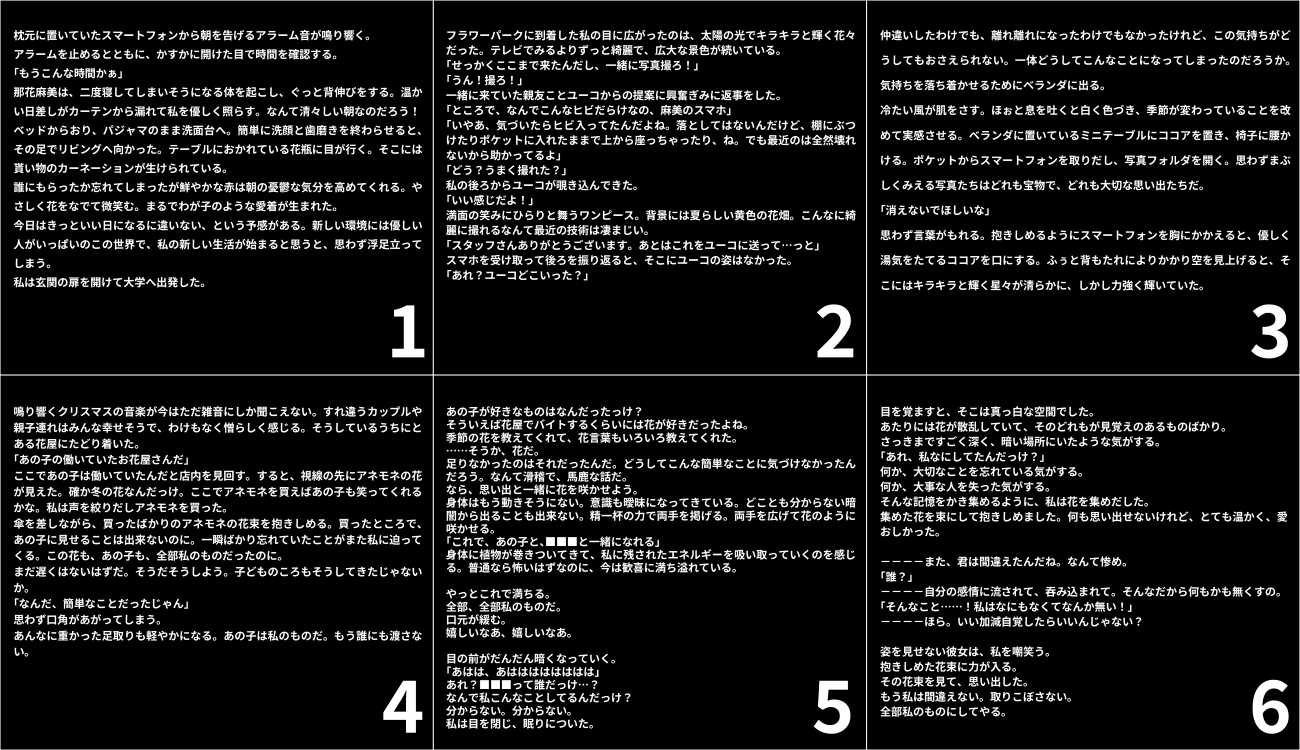 今後の展望として、シナリオのエンディングを二種類用意することを考えている。1つ目は先に掲載しているものを、もう1つはとある分岐点から物語やイラストの見え方がガラッと変わるようなギミックを制作する予定だ。ここでもクリアファイルの利点を活用し、シナリオシートを差し替えることでシナリオを変えることができる。これを商品として販売した際にも様々なシナリオで楽しんでもらえる仕組みになるだろう。