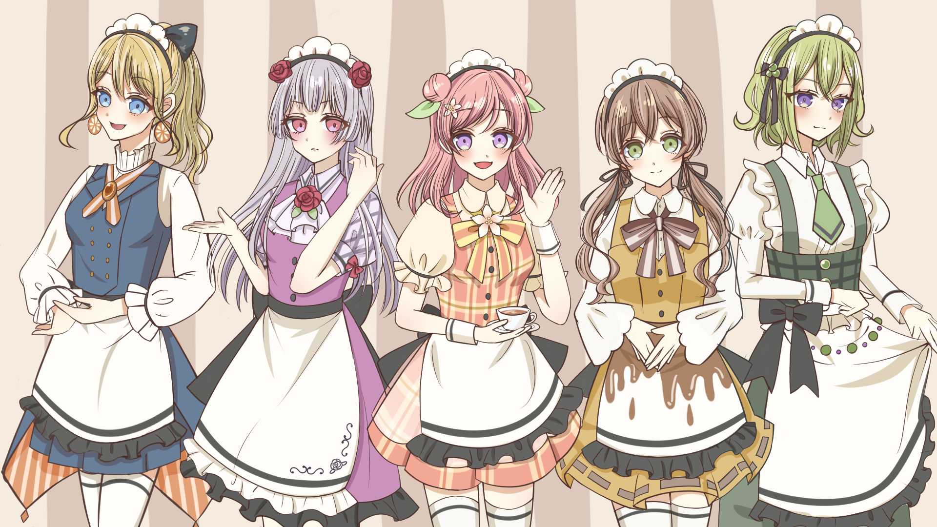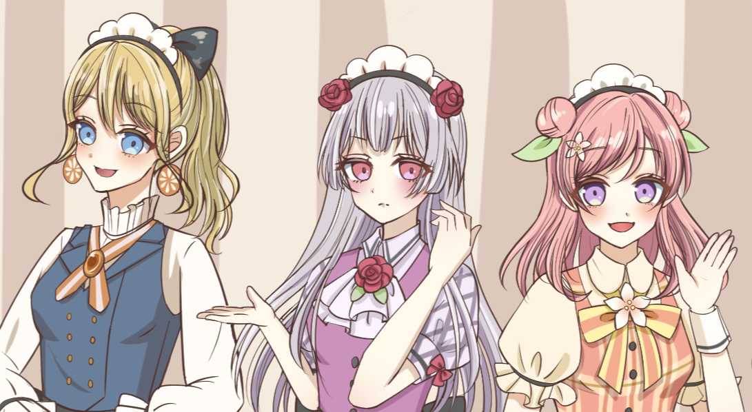 また、イメージカラーがかぶらないように気を付け、それぞれの紅茶イメージをリボンの形やスカート丈を変え、服のデザインに組み合わせた。