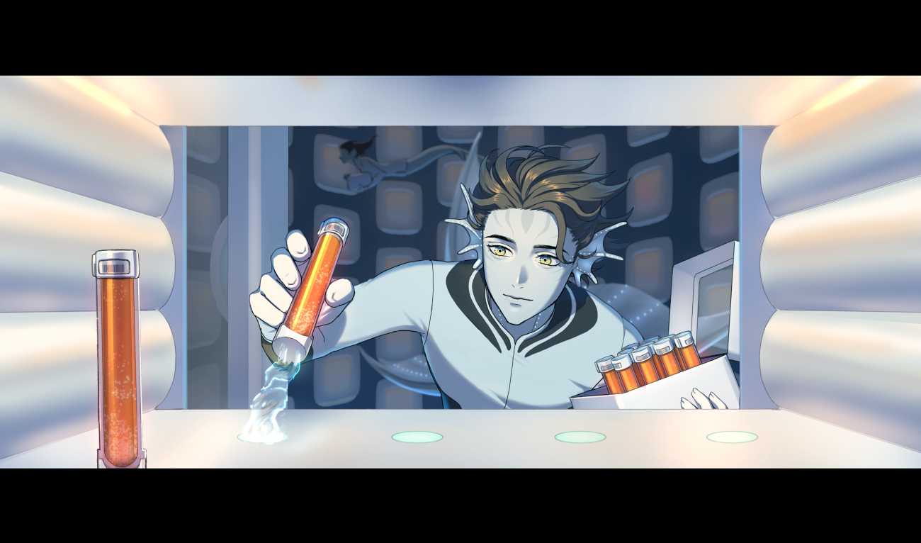 🎬1『魂のバイアル』 場所はラボの中にある、”魂”の大型貯蔵倉庫。 アダニスは特殊な瓶に入った採れたての”魂”達を専用の保管庫に入れている。保管庫は出荷が来るまで魂の鮮度を保てるようにしている。