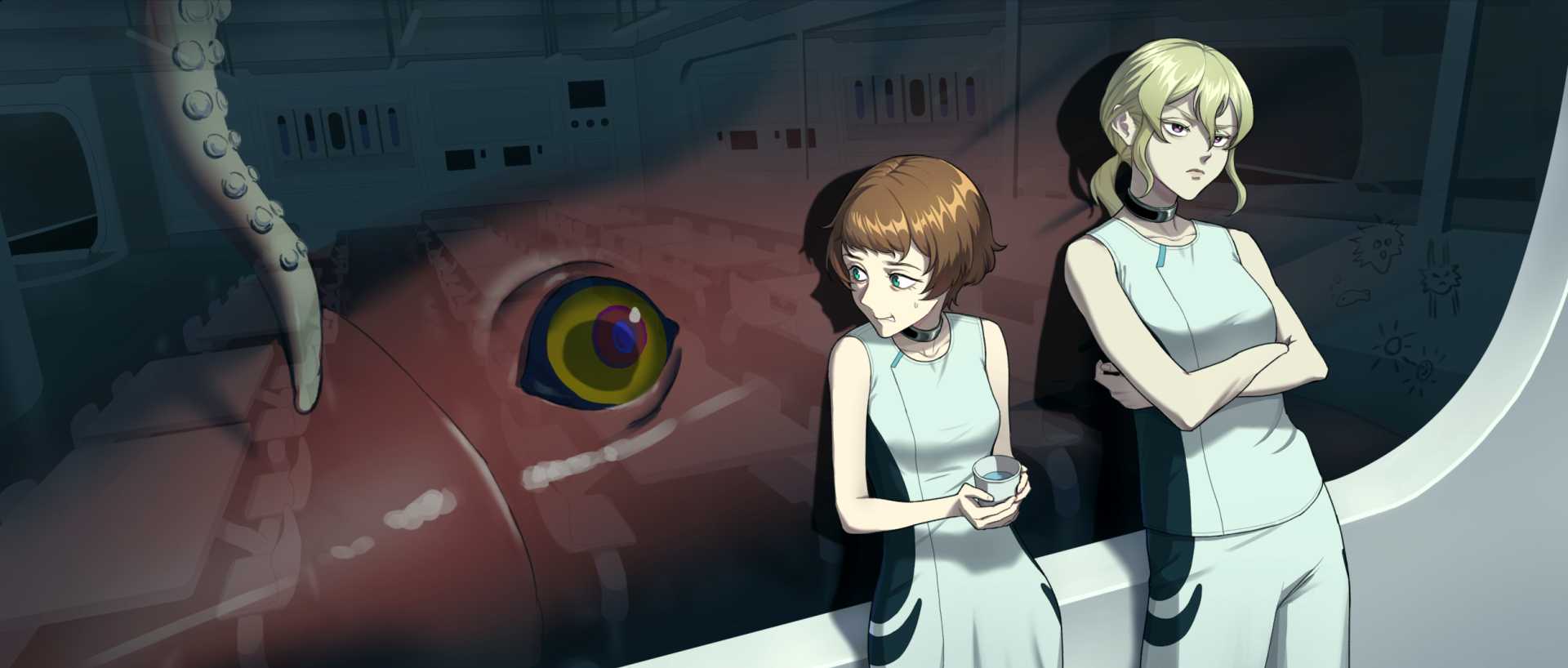 🎬2『脱出は夢の中で』ラボについたばかりのエバは同じドミトリーの友人と人間棟の食堂の窓際でたそがれている。 しかし、エバは恐ろしい生き物と目を合わせてしまい、ここは深い海の中である事を身をもって知る。
