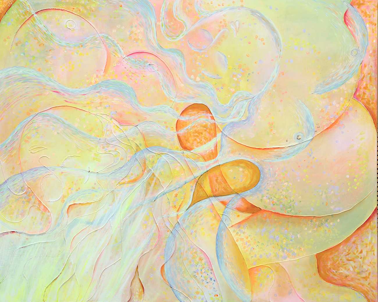 同時に、本作品は日本の伝統をそのまま再現する試みではない。日本髪という伝統的モチーフを起点としながら、西洋的な色彩感覚や左右対称という構造を取り入れることで、異なる文化の感性を一つの画面に共存させている。東洋か西洋かという二項対立を示すのではなく、それぞれが持つ特質が相互に学び合い、溶け合う状態を視覚化することを意図した。
