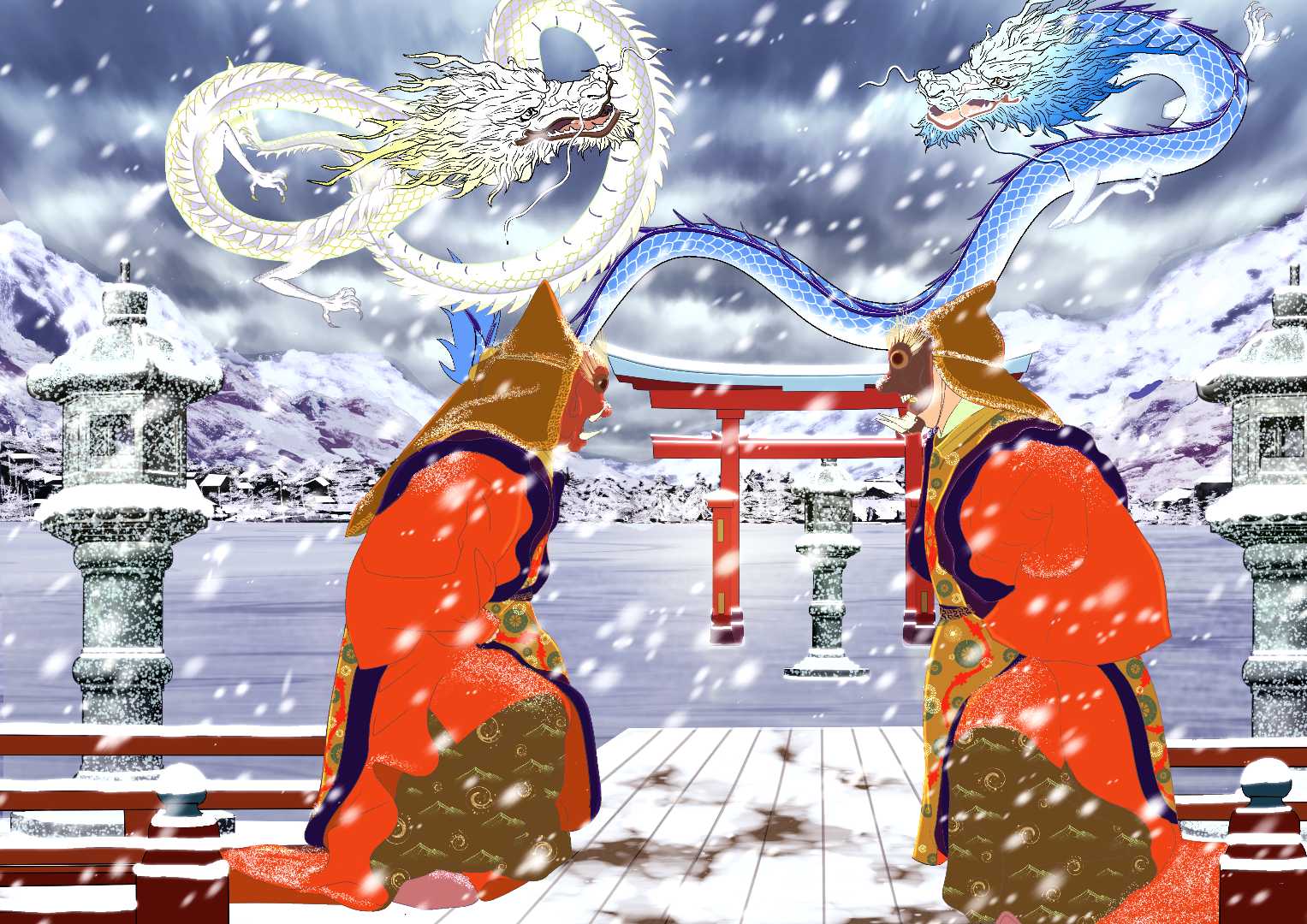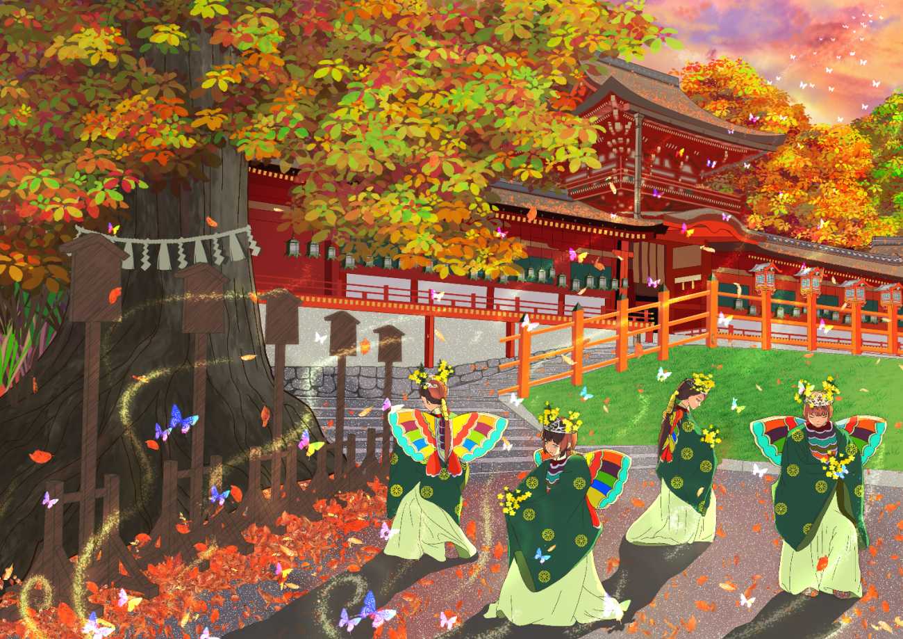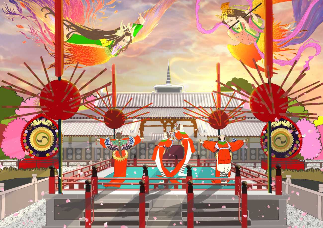 今回制作したイラストでは、古代の祈りに根ざした象徴的な情景を、現代の視覚感性によって幻想的な物語世界へと拡張することを試みている。舞楽の持つ荘厳さと高度な様式美を基盤に、神話的な世界観を通してその魅力を現代的なビジュアルとして表現することを目指した。