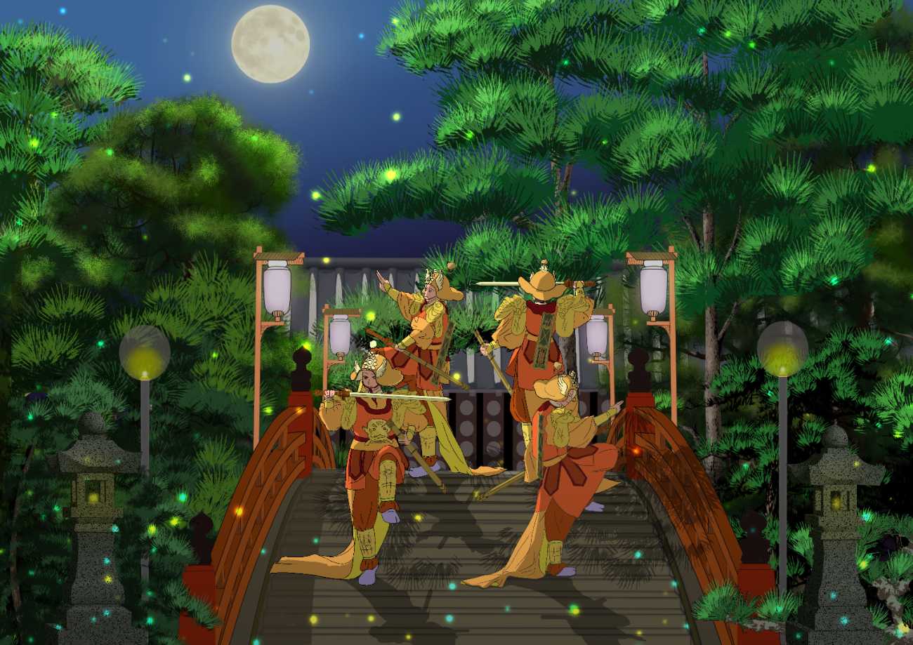 四季舞楽の② 『太平楽』:戦乱や災厄を鎮める神舞として、舞人が朱塗りの太鼓橋の中央に堂々と立ち、太平の神将が剣を掲げて世の安寧を祈る姿と格式を画面に示している。