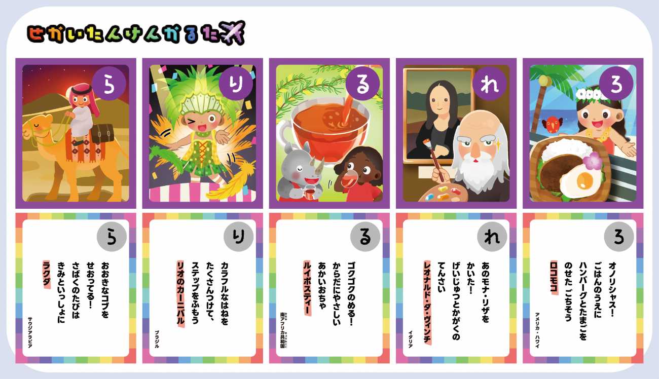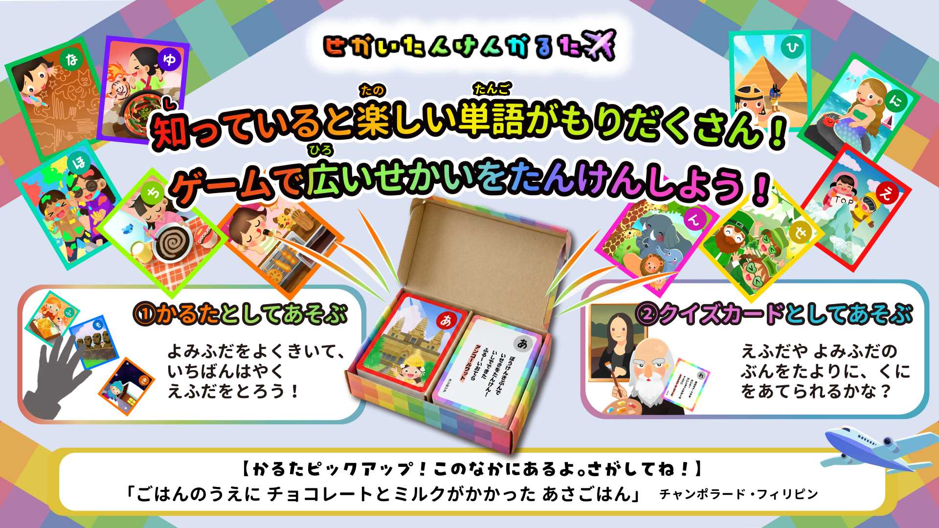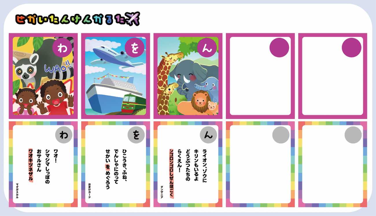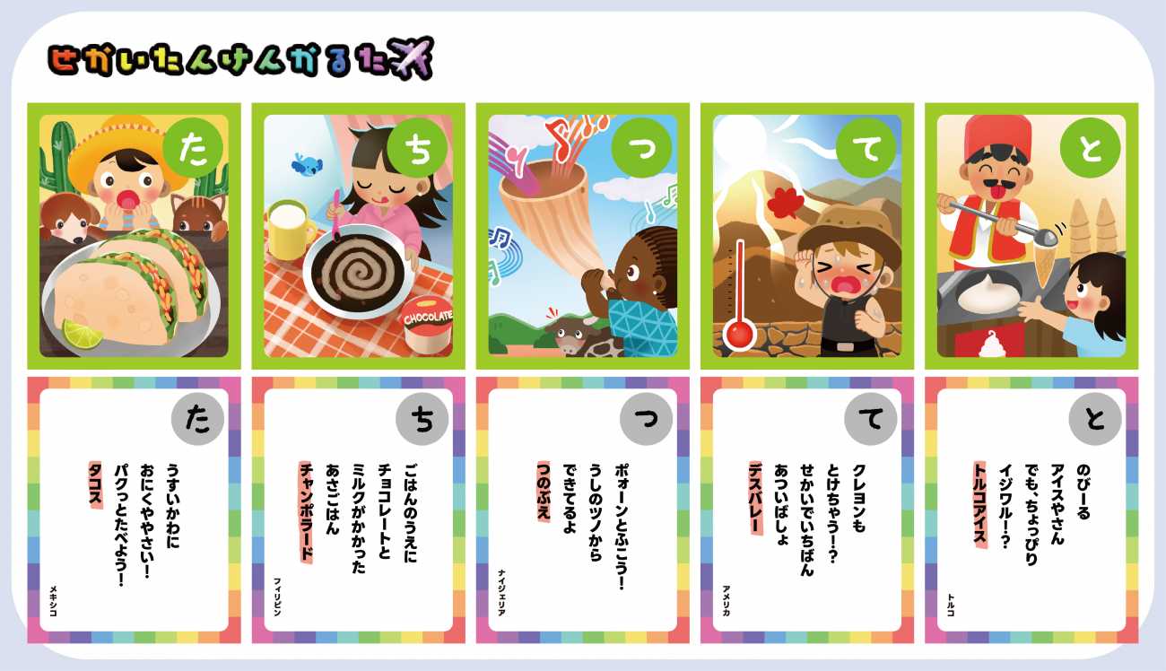 各カードには、世界各地の名所・食べ物・偉人などをテーマにした単語と、それに関連するイラストを収録しています。子どもたちが遊びながら自然に知識を広げ、さまざまな人や文化を大切に思う気持ちを育んでほしいという思いで制作しました。