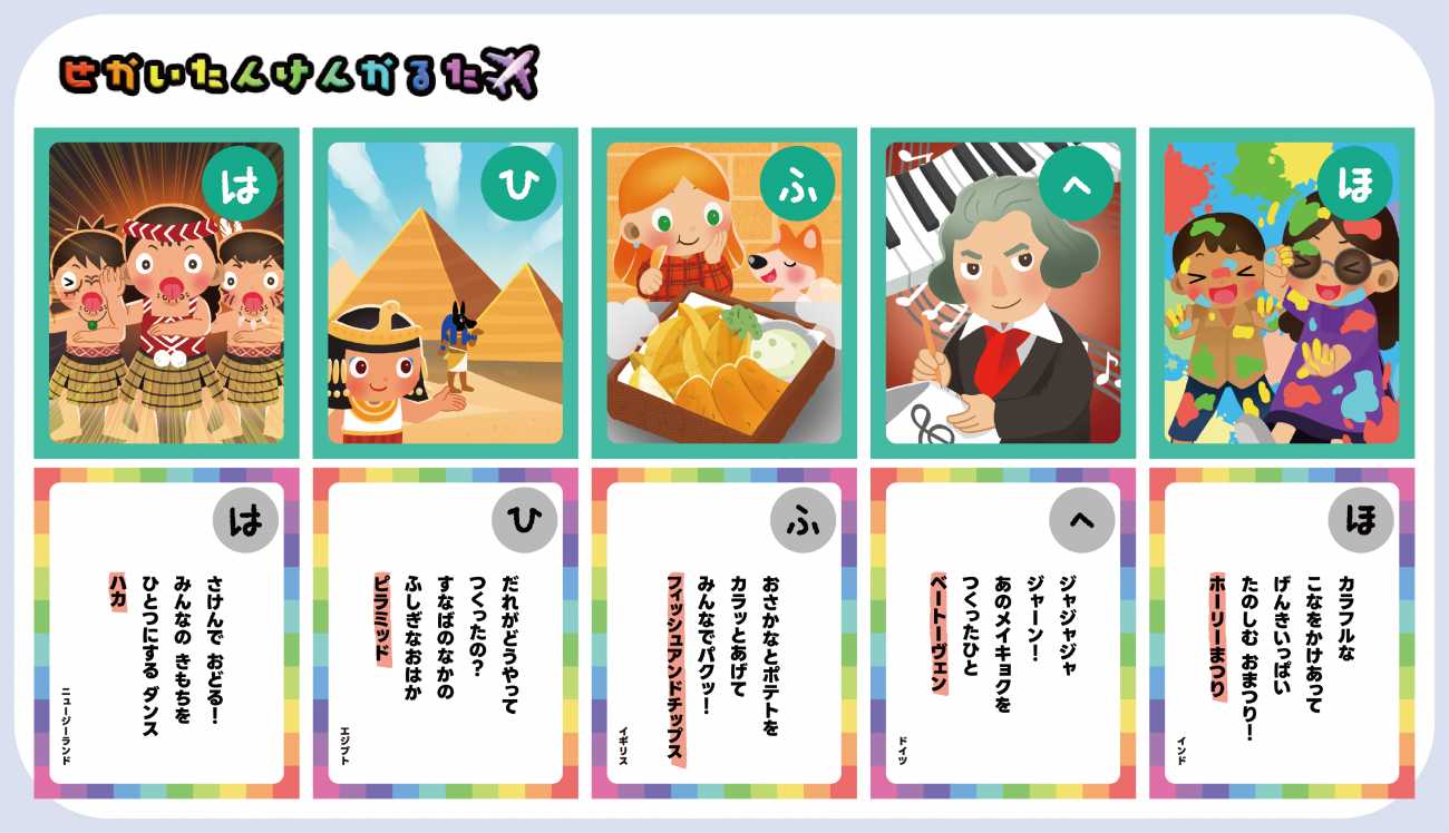 絵札の縁は「あ行」「か行」など段ごとに色分けしており、ひらがな学習をさりげなくサポートします。