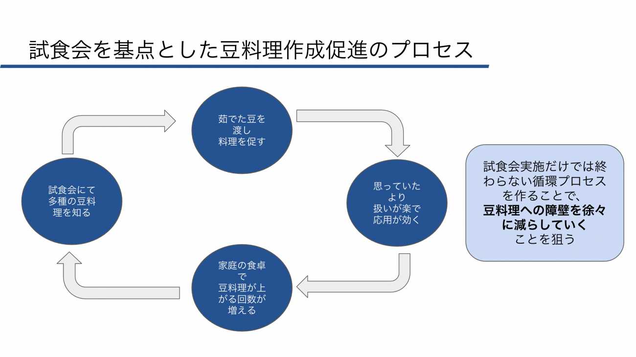 持ち帰った茹で豆を自宅で調理します。豆料理が食卓にあがり、家族の評判が良ければ豆料理の頻度が増え、また試食会で新たなメニューを知りたいと思います。このサイクルが回り始め消費量が増えると考えます。