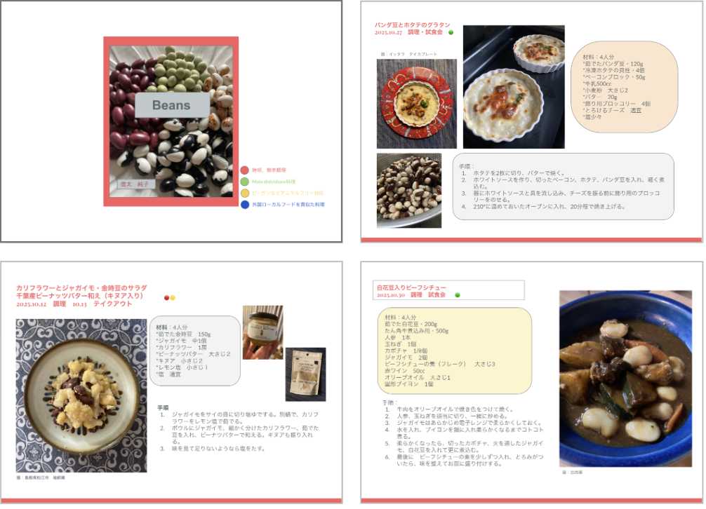 作った豆料理の調理方法を「レシピブック」にまとめ、参考にしてもらい、家庭でも簡単に試食会の料理を再現できるようにします。
