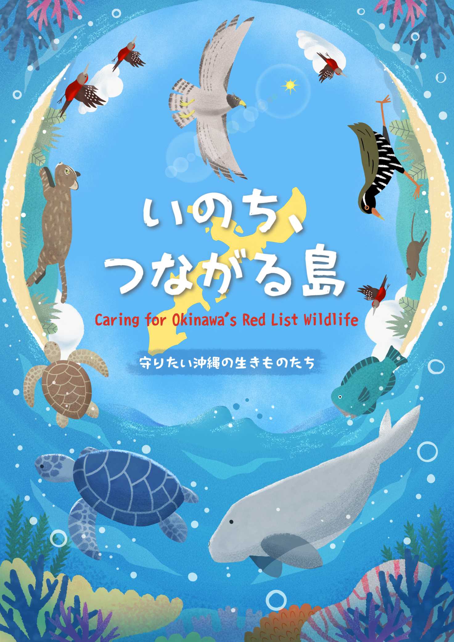 本作品は、沖縄に生息する絶滅の危機にある生きものをテーマにした啓発ポスターです。陸・海・空が深くつながり、さまざまな生きものが支え合って生きている沖縄の自然に目を向け、その「いのちのつながり」を絵で伝えることで、人と自然が共に生きることの大切さを感じてもらうことを目指しています。
