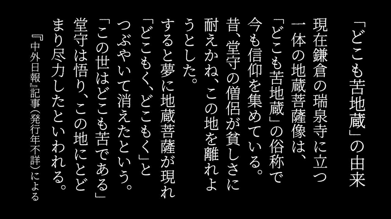 まだ平成の頃、「どこも苦地蔵」に会いに行った。鎌倉の瑞泉寺に立つ一体の地蔵菩薩立像。鎌倉時代中期から鎮座場所も転々としてきた古仏だ。小さなお堂で、堂の上部が暗くて表情もはっきり見えず、感動に打たれたわけでもない。しかしこれが私と「どこも苦地蔵」の付き合いの始まりだった。