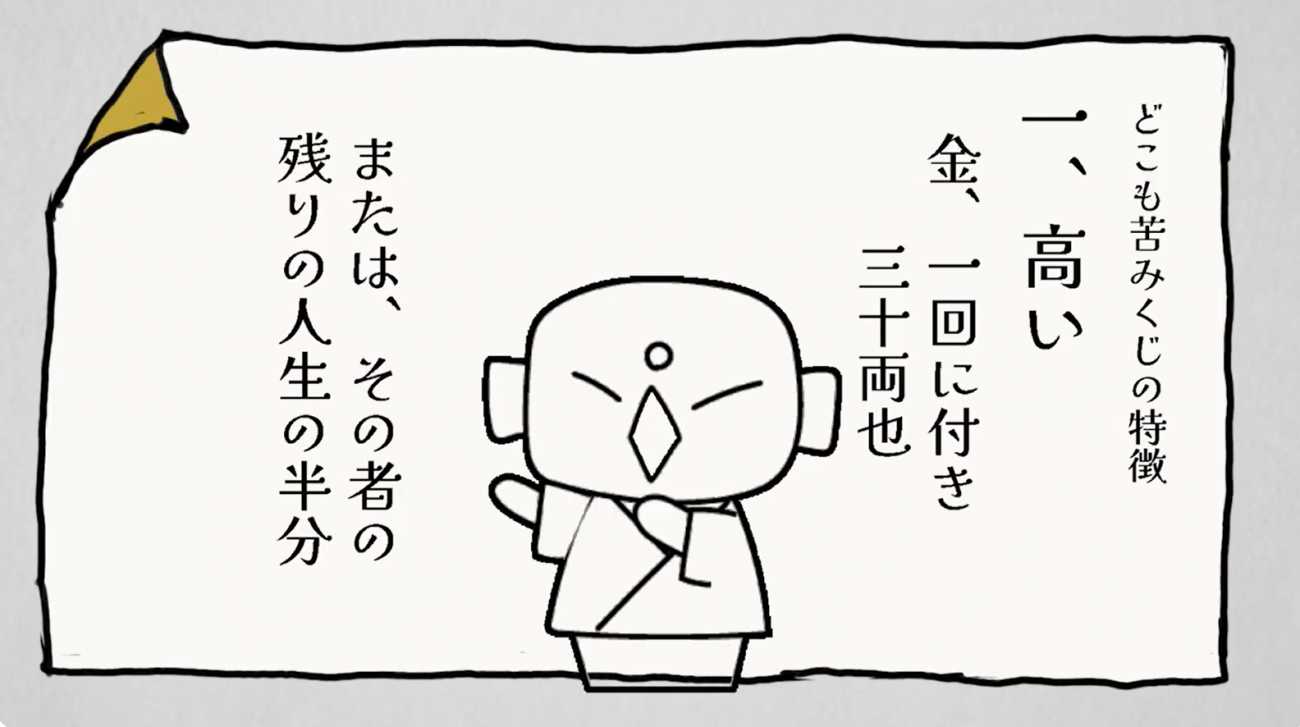 作品中トリッキーな装置となっている「おみくじ」。「高い」「凶が多い」「当たる」が三大特徴。そんなおみくじを買う人なんているのかと思うのももっともだが、実は年に十人くらいは客がいたと考える(私は)。