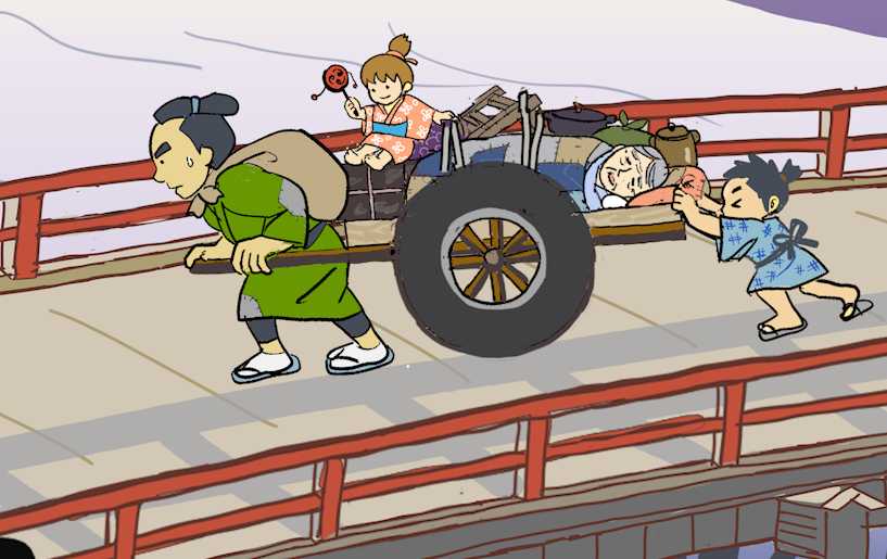 住むところを追われて大八車に家族と家財道具を乗せて行く「重い荷物で行く男」。この家族と、踊り子になる女の子と、父親を背負って歩く青年、お救い小屋の男が別人かつながっているかの判断は見る者に任せたい。