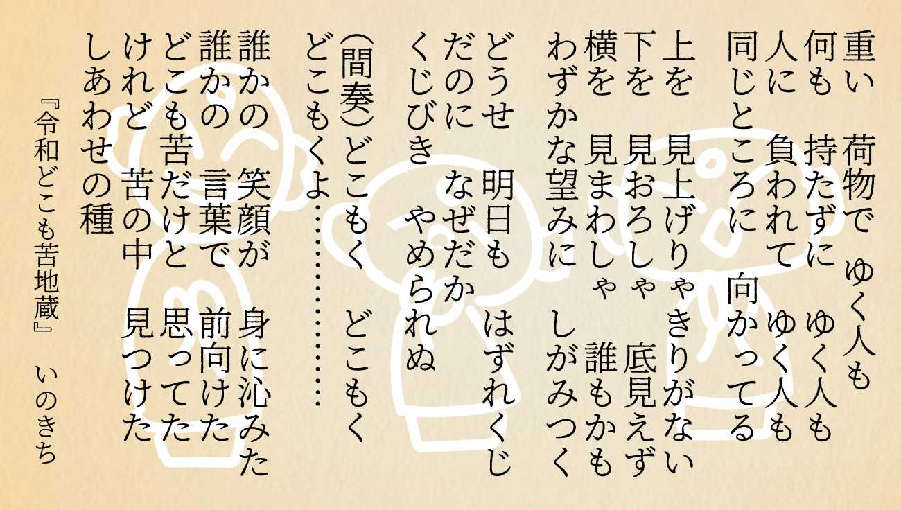 「どこも苦」だから耐えておれ、なんてもう誰が言えるか。しかし意外にも、幸福と不幸について、この作品を完成させようと小地蔵たちをジタバタさせる過程で考えることが多かった。小地蔵たちは結構一生懸命なのに、結局何もできず、誰のためにもなっていない。でも「お地蔵さん」とはもともとそういうものじゃなかったろうか。願って、かなわなくて、でも今日の無事を感謝する。やっぱり守ってくれているのかもしれない。