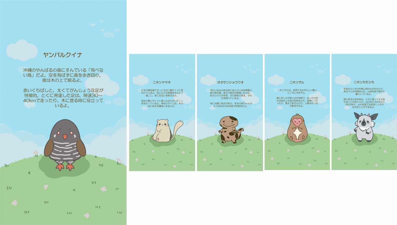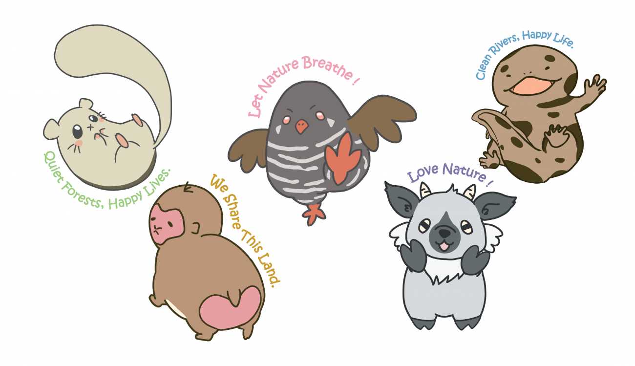 日本の固有種や自然保護に興味を持ってもらうことを目的とし、グッズ(ステッカー)を作成しました。モチーフは日本の固有種の生物で、生物をゆるく、かわいくデフォルメをすることで親しみやすさのあるイラストとして仕上げました。ターゲットは、スマホを多く使用する日本の若者層や、インバウンドを想定しています。若者に受け入れられるデザインを意識しつつ、生物の特徴を捉えたイラストを目指しました。日本の生物の多様性や、魅力を知ってもらうため、日本の固有種の中から、哺乳類をはじめ、両生類や鳥類など、さまざまな生物を選定しました。