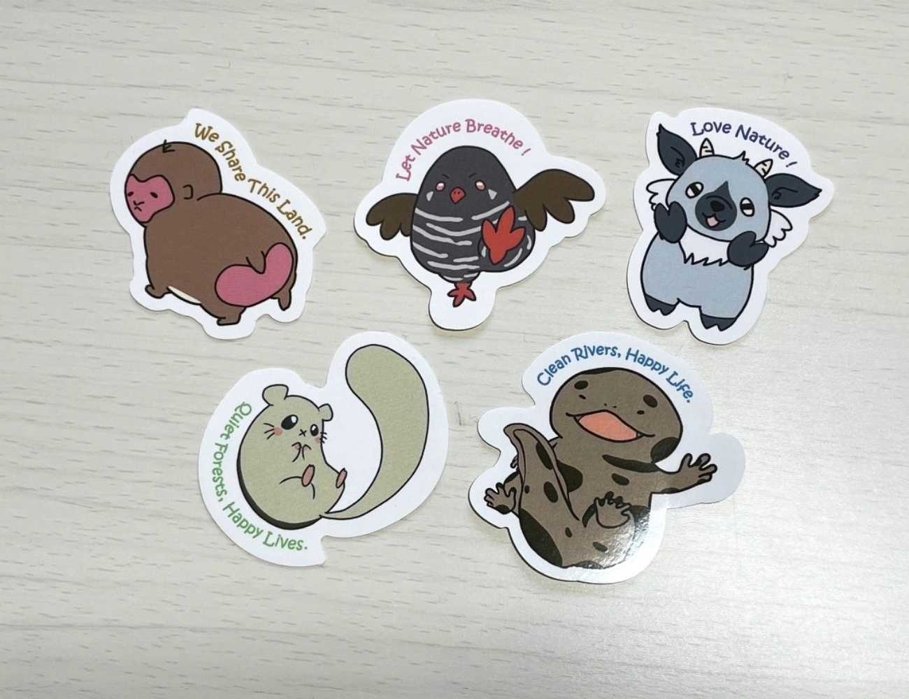 ステッカー仕上がり。イラストに自然保護を意識したメッセージを英語で添えています。