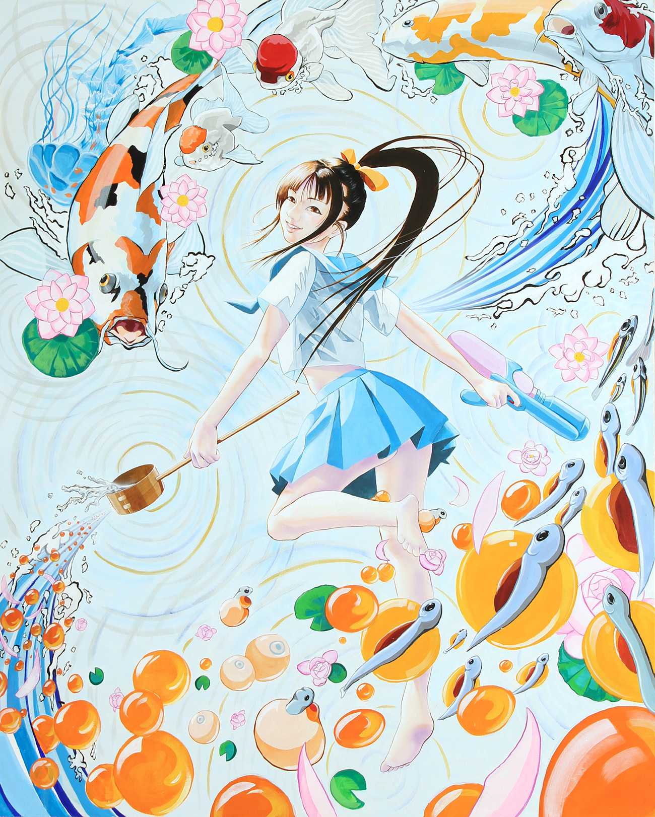 HOME 洋画コース 「電波炎上神性反抗少女・カグツチ」 「電波炎上神性反抗少女・カグツチ」 洋画コース 佐伯 呼南 162 × 130.3cm キャンバス/アクリル、コラージュ 画像を拡大 CLOSE 本制作では、日本の『古事記』に登場する水の神「ミズハノメガミ」と火の神「ヒノカミカグツチ」をモチーフに、神話を現代的に再構築した。水の神は寒色系を用いた清楚で無邪気な少女として、火の神は暖色系を基調に平成的なギャル像として描き、相反する性質を直感的に表現している。聖と俗、神話と現代が交錯する矛盾を内包した美を描くこと。それが、私にとっての神との対話であり、絵を描く理由の核心である。 「環状清泉神性調和少女・ミヅハノメ」 162 × 130.3cm キャンバス/アクリル Tag #アクリル画 #イメージを描く #洋画 佐伯 呼南 洋画コース CONTACT Share Xでシェアする LINEでシェアする このコースのその他作品 洋画コース 2025年度作品 作者松隈 あや 洋画コース 2025年度作品 作者加藤 敦史 洋画コース 2025年度作品 作者八木 貴子 洋画コース 2025年度作品 作者都築 久子 洋画コース 2025年度作品 作者村島 由里絵 洋画コース 2025年度作品 作者阪本 育代 洋画コース 2025年度作品 作者土田 あゆみ 洋画コース 2025年度作品 作者松井 葉子 洋画コース 2025年度作品 作者勝股 晴美 洋画コース 2025年度作品 作者小幡 智子