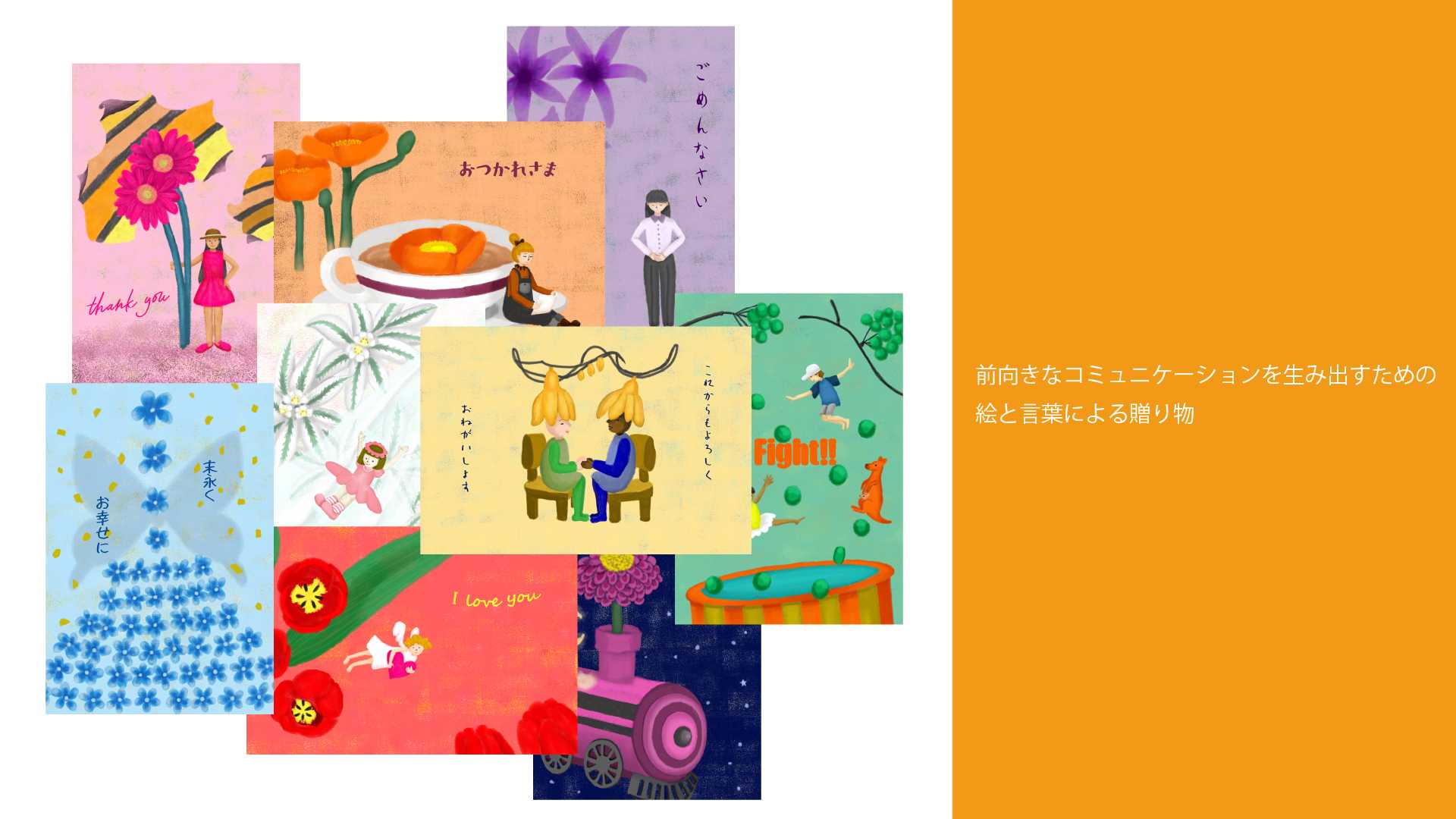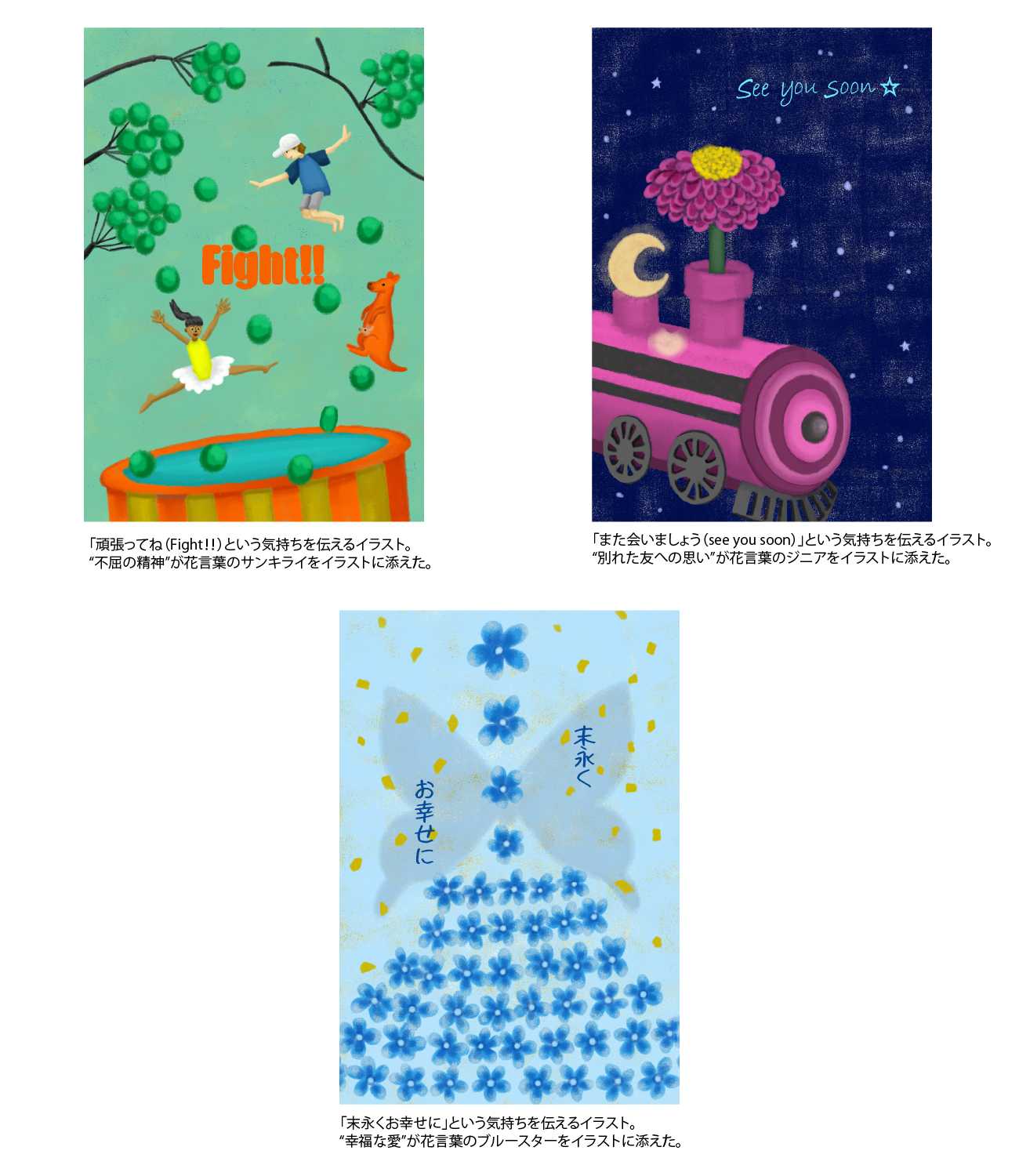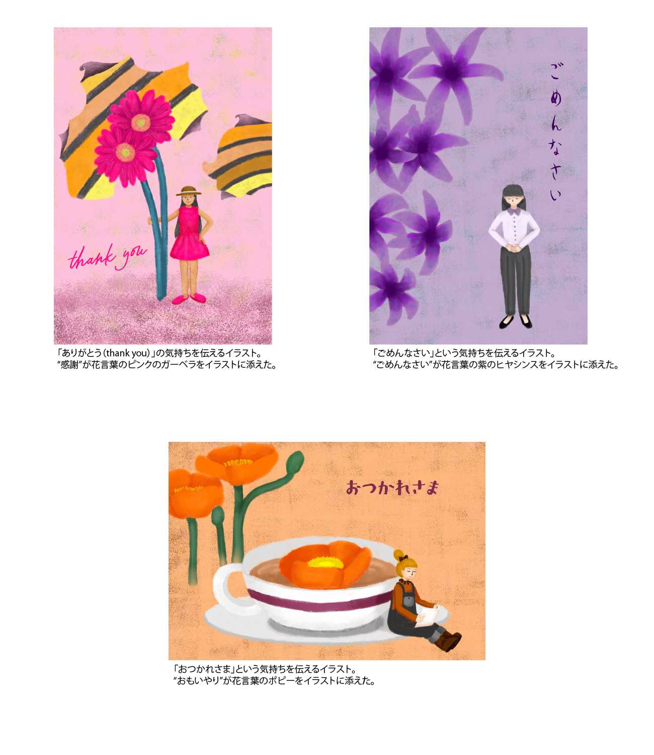 前向きなコミュニケーションにはたった一言のあいさつが大切であるという思いから、 一言を添えた連作イラストとそれをもとにポストカードを制作した。9つのイラストには、 それぞれのあいさつに関連した花言葉の花をモチーフに描いている。