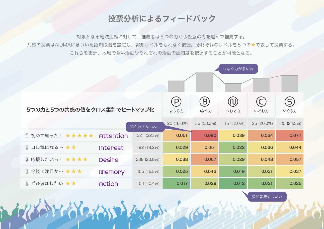 地域活動の主体は、5つの共感の分布から周知不足や参加促進の必要性などがわかります。また、推薦する行政団体などは、5つの力の分布から地域における活動の状況がわかります。