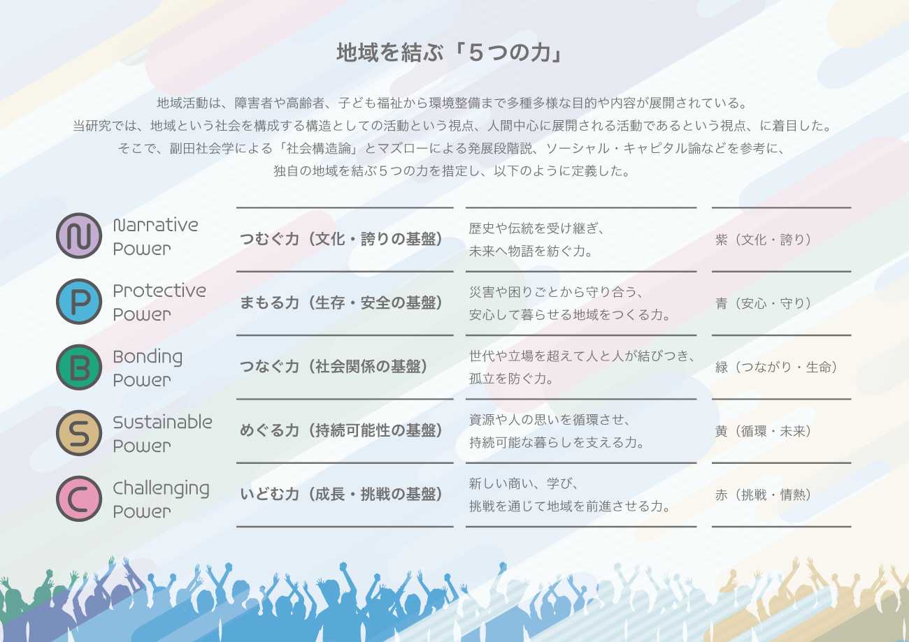 5つの力は先行研究を参考にしつつ、最近では定着した感のあるサスティナブルな視点を含めたり、福祉にとどまらず地域商店を含めたり、産学官の連携を見込んで独自に定義しています。