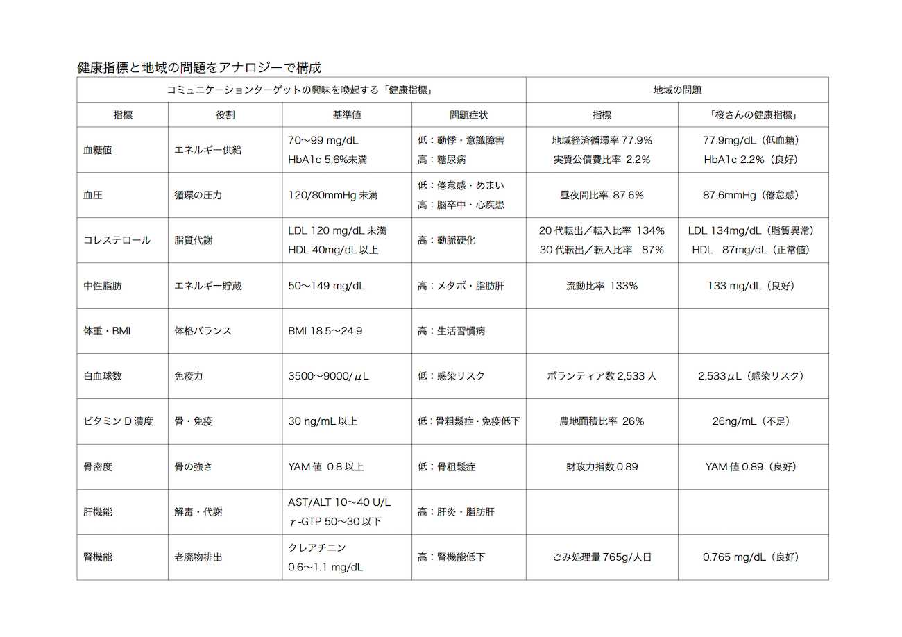 ターゲットは健康診断の数値が気になり、その意味を理解している世代。そこで、さまざまな健康診断の数値から地域の問題をアナロジーで類推させる仕掛けで、興味を喚起します。