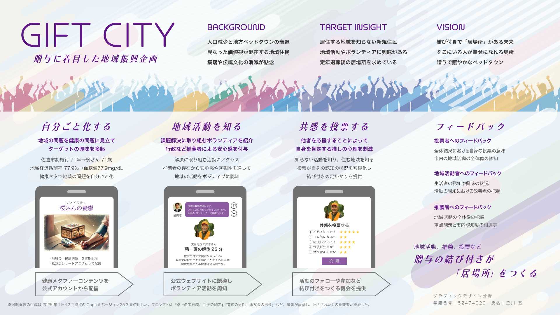 具体的な企画は「自分ごと化する」「地域活動を知る」「共感を投票する」の3ステップで構成されます。まず、地域の問題を人々の健康問題と捉え、あまり意識することのない地域の問題を身近に引き寄せます。次に、その問題を解決しようとしている活動を紹介します。これらの活動は主にサムウェアズにより営まれているため、エニウェアズはそれを知るきっかけとなります。最後に、投票という仕組みを準備します。地域の問題を解決しようとしている活動に対し、知らなかった!参加したい!などの気持ちを投票することは、自身の態度の顕在化を促します。つまり、地域活動などのボランティアはそれ自体がすでに贈与であり、投票という仕組みは投票権の贈与です。これら贈与の結び付きが人々の結び付きを醸成し、延いては「居場所」をつくるための行動変容を促します。