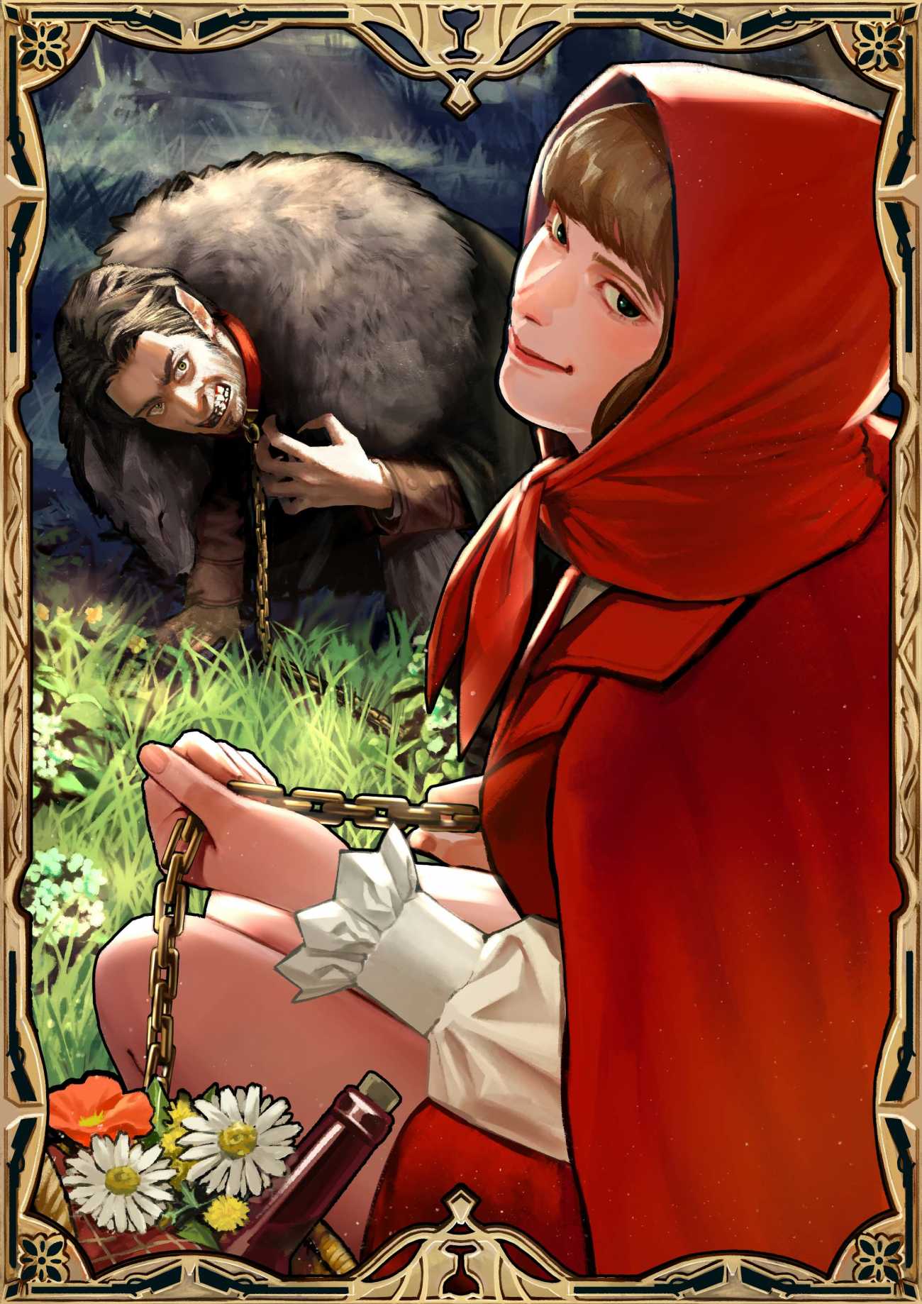 『赤ずきん』は、若い女性は悪い男性に狙われやすいから気をつけろという教訓が込められた物語です。初めはオオカミに騙されてしまい食べられてしまった赤ずきんですが、オオカミの腹から救出されたあとで、石を腹に詰め込み、喉の渇きから水を欲したオオカミが井戸に落ちるように仕向けます。そうした赤ずきんの秘められた力強さをサディスティックな一面と解釈し、お話の結末を「悪いオオカミを赤ずきんがしつける」というものに改変することで、オオカミと赤ずきんの力関係の逆転を描きました。ここでは、お話の後日談として、赤ずきんがオオカミを連れてかつて出会った森の花畑へと散歩に連れてきた場面を描いています。