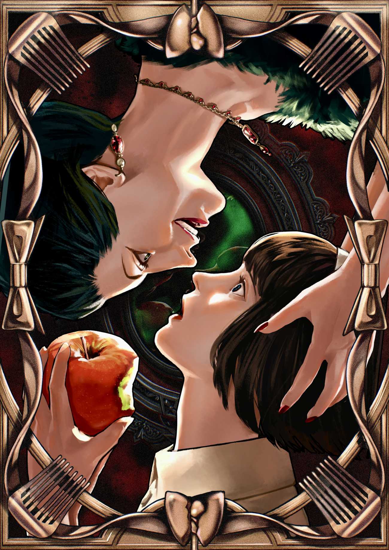 『白雪姫』では、原作から大きな改変を行わず、美のためならば殺人をも厭わない継母の執着と狂気に焦点を当てました。毒リンゴで義娘を殺すことで世界一の美女の座を奪還し喜ぶ継母と、毒が回って意識を失いかけている白雪姫の表情を象徴的に描き、ホラーテイストに仕上げました。また、人物の表情に加えて、枠の装飾に継母が殺しに使ったアイテムと手に入れて食した心臓と肺を描くことで、継母の白雪姫殺しへの執念の深さを表現しました。