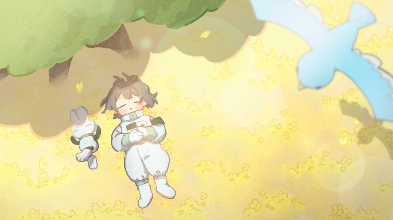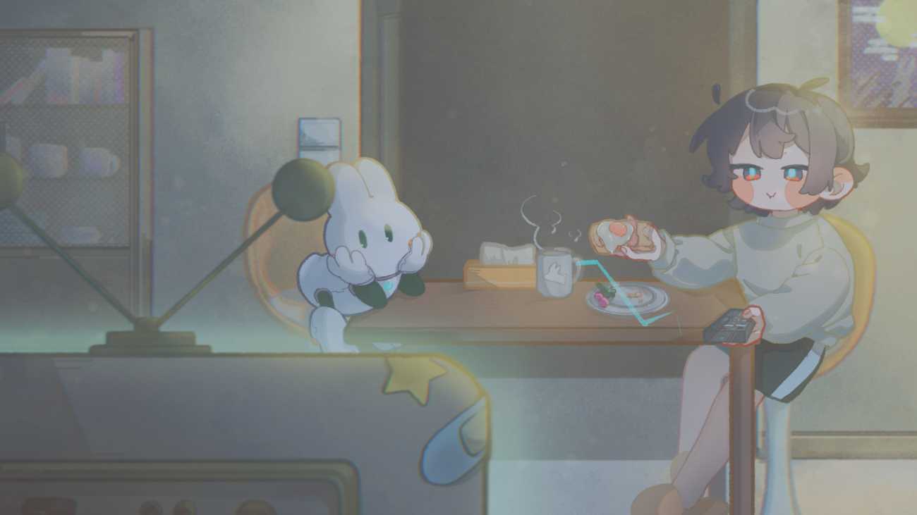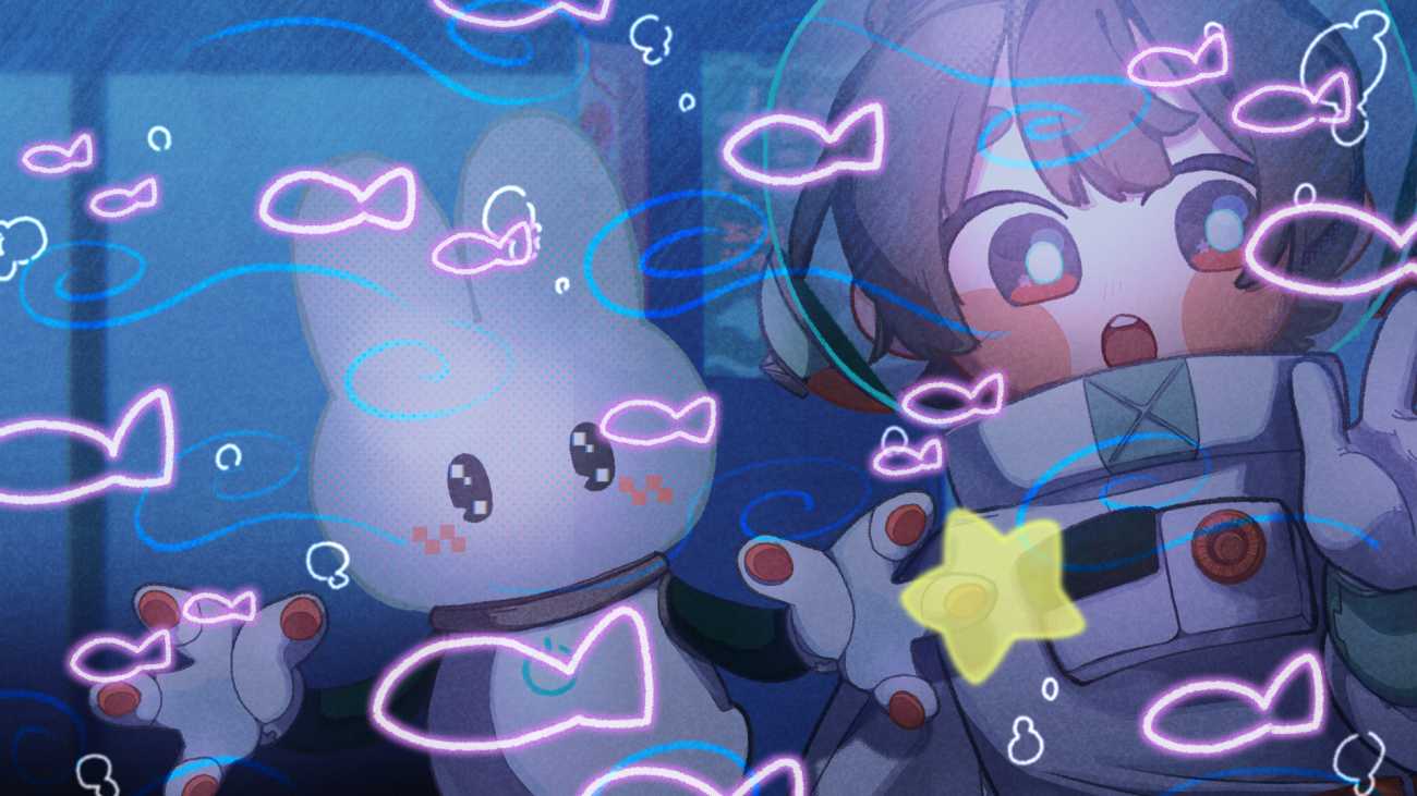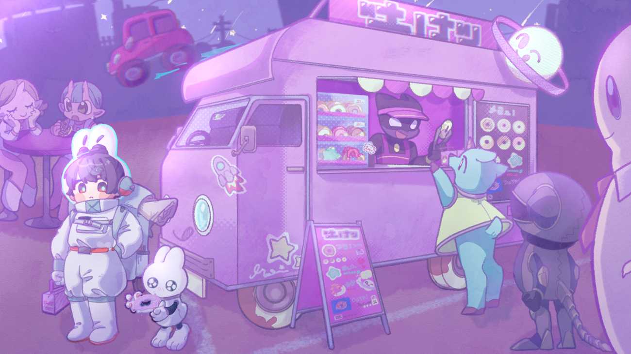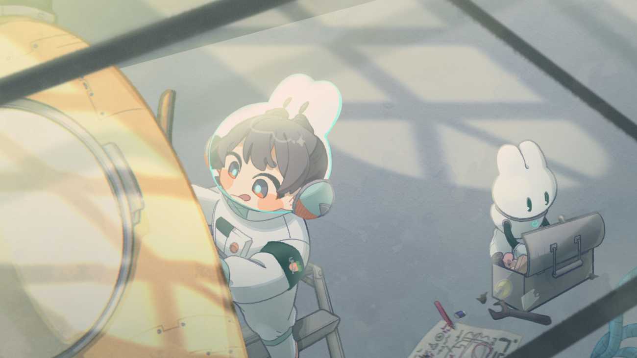 メインキャラクターである「整備士とロボットうさぎ」は、「宇宙×うさぎ」をテーマに、シンプルだけどキャッチーなシルエットにすることで、連作のあらゆる場面にも馴染みながらも、どこにいるかがわかるデザインを心がけています。