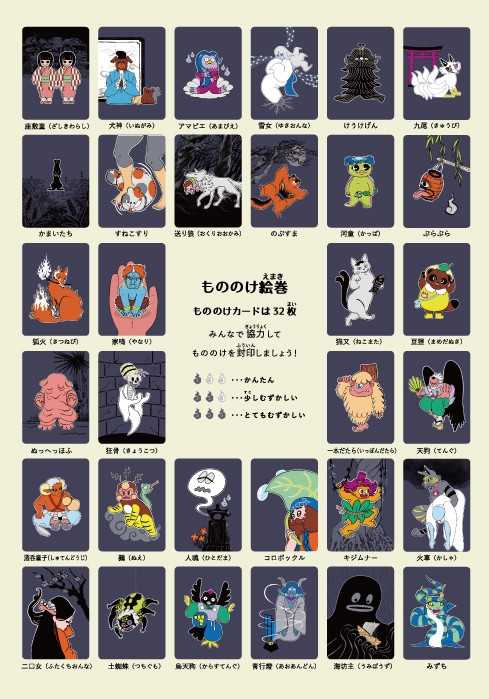 もののけ絵巻。こちらは32体のもののけを確認できます。裏面のイラストは少しづつ違うのですが、どう違うのかは体験してみてのお楽しみです。