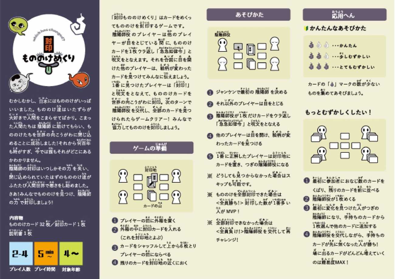 ◾️【封印もののけめくり】は陰陽師(おんみょうじ)役のプレイヤーが見つけた「もののけ」を、他のプレイヤー全員で協力して封印するゲームです。