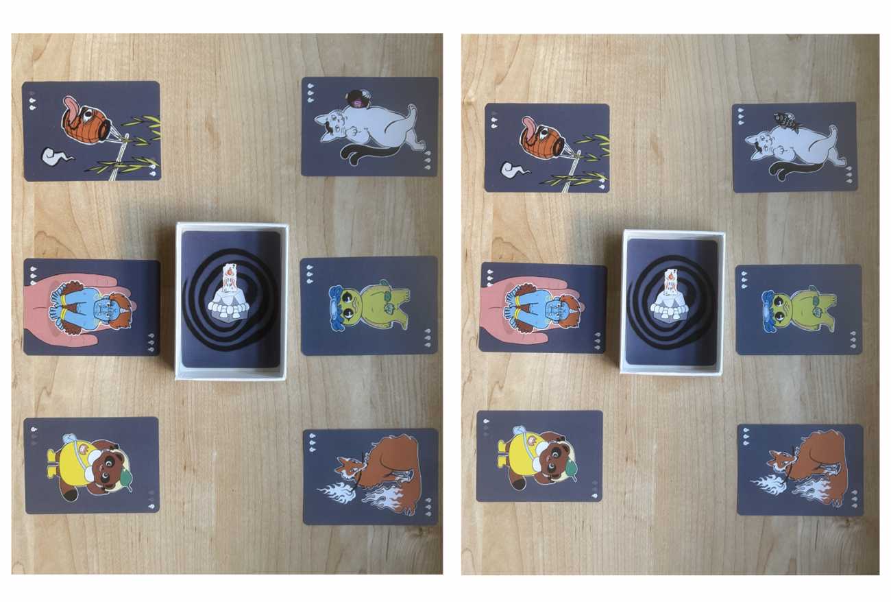 2.呪文を合図に目を開けた他のプレイヤーは、絵柄が変化したカードを見つけてみんなに伝えましょう。