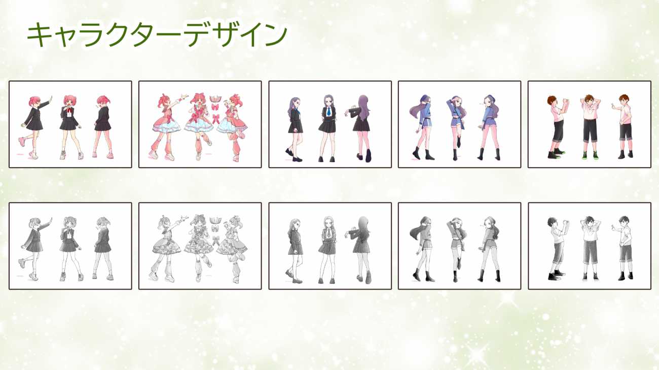 キャラクターデザイン一覧です。全員分カラーもモノクロも制作しました。