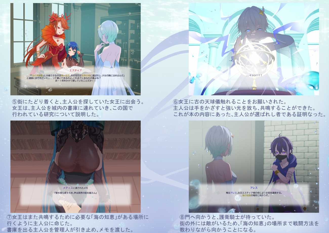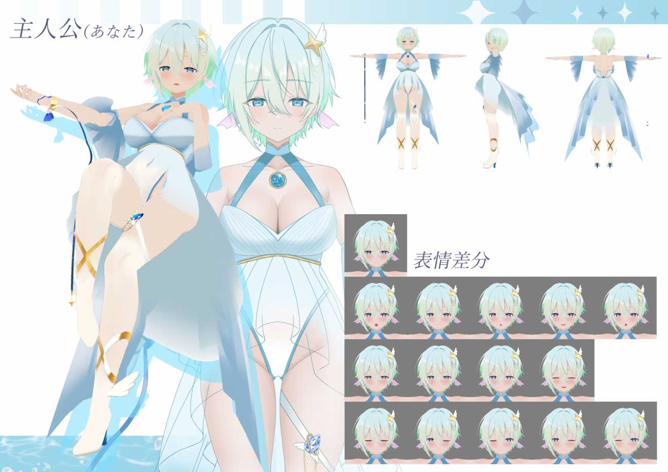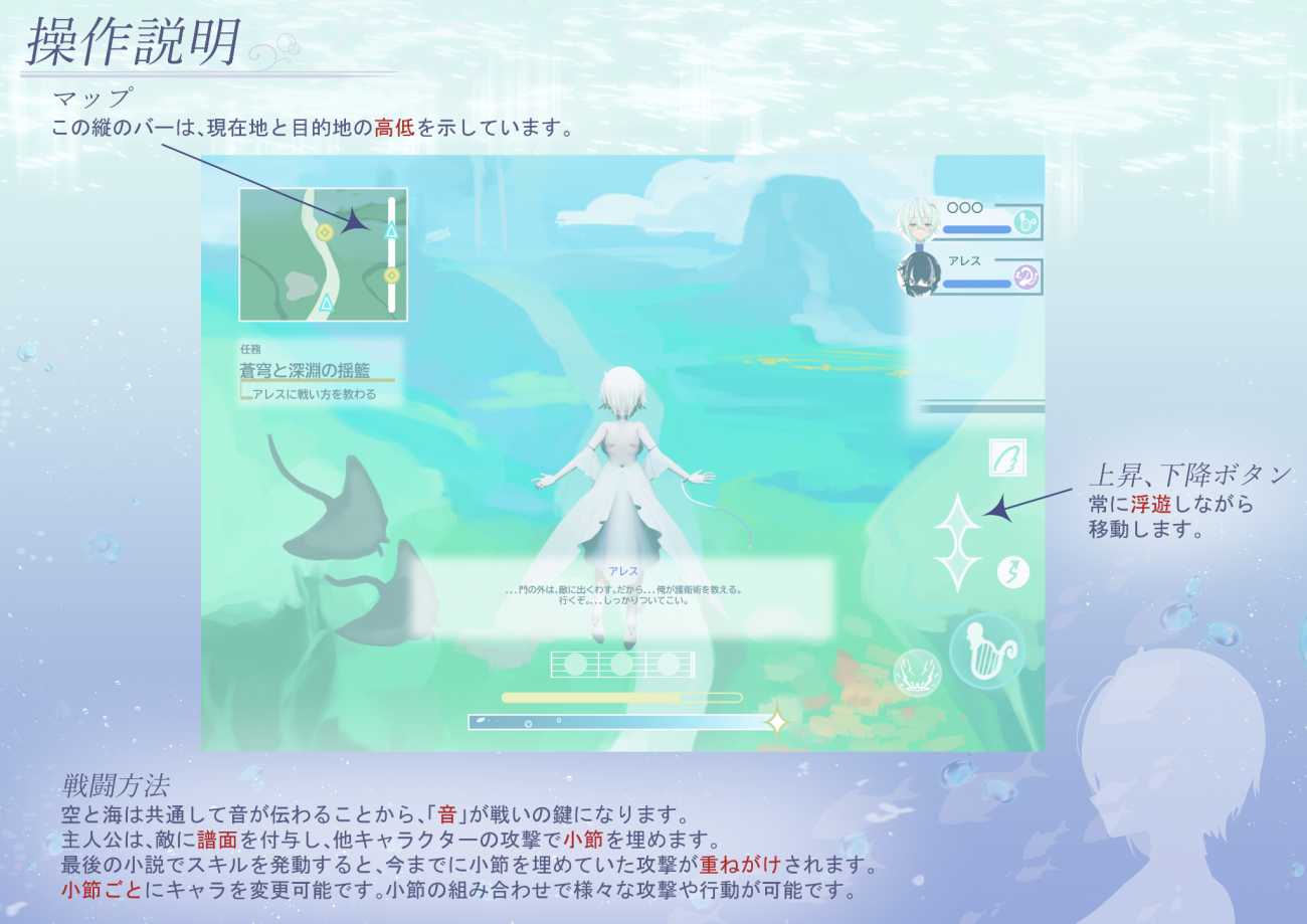 今回のゲームデザインでは、光・水色・浮遊感といったビジュアル表現を重視し、全体を「空中か水中か判然としない表現」と整合させるよう設計しました。世界観を決定し、導入シーンの場面イラスト群を中心に、主要キャラクターデザイン、キービジュアル、想定プレイ画面のUI案、および3Dキャラクター制作(女性主人公)を制作しました。