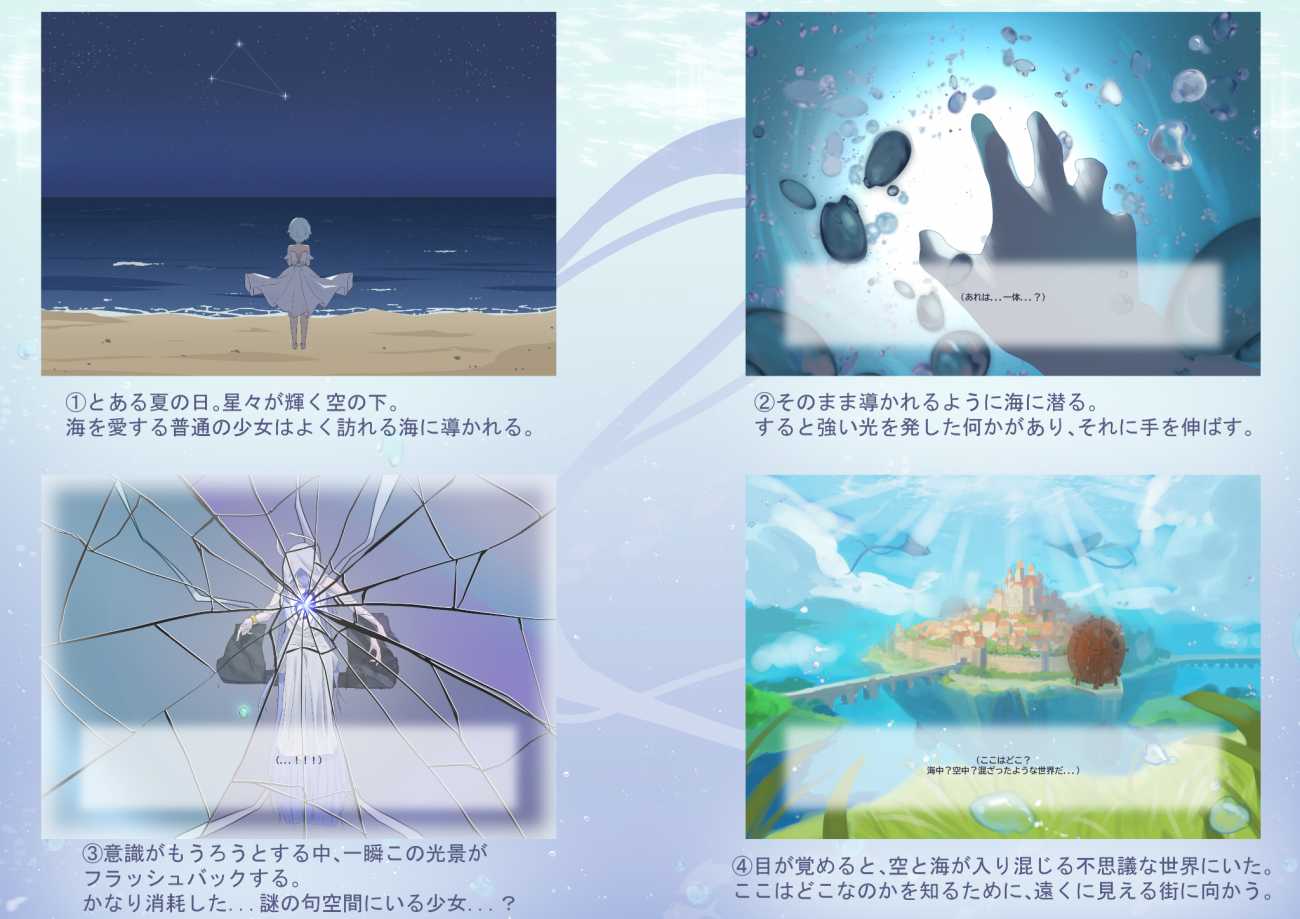 夏の夜、星々が強く輝く空の下。現代を生きる海と空を愛するごく普通の少女は、いつも行く海に導かれるように潜り、海底の強い光に手を伸ばす。目が覚めると、空と海が溶け合った不思議な世界だった。この時知らぬ間に少女の胸に水色の宝石が宿っていた。この宝石を宿す存在がその世界が失った「空と海の境界線」を探す唯一の鍵だった。