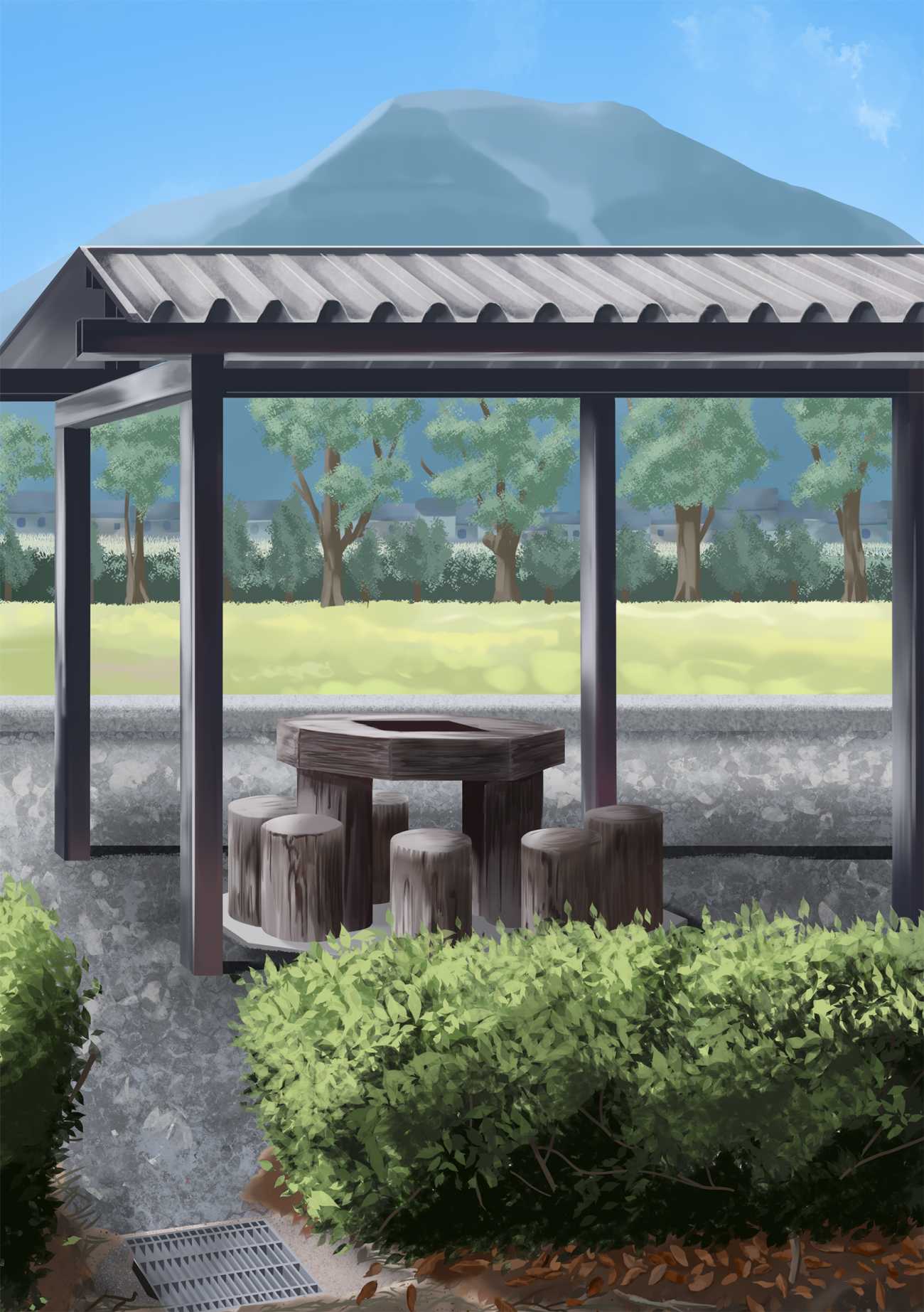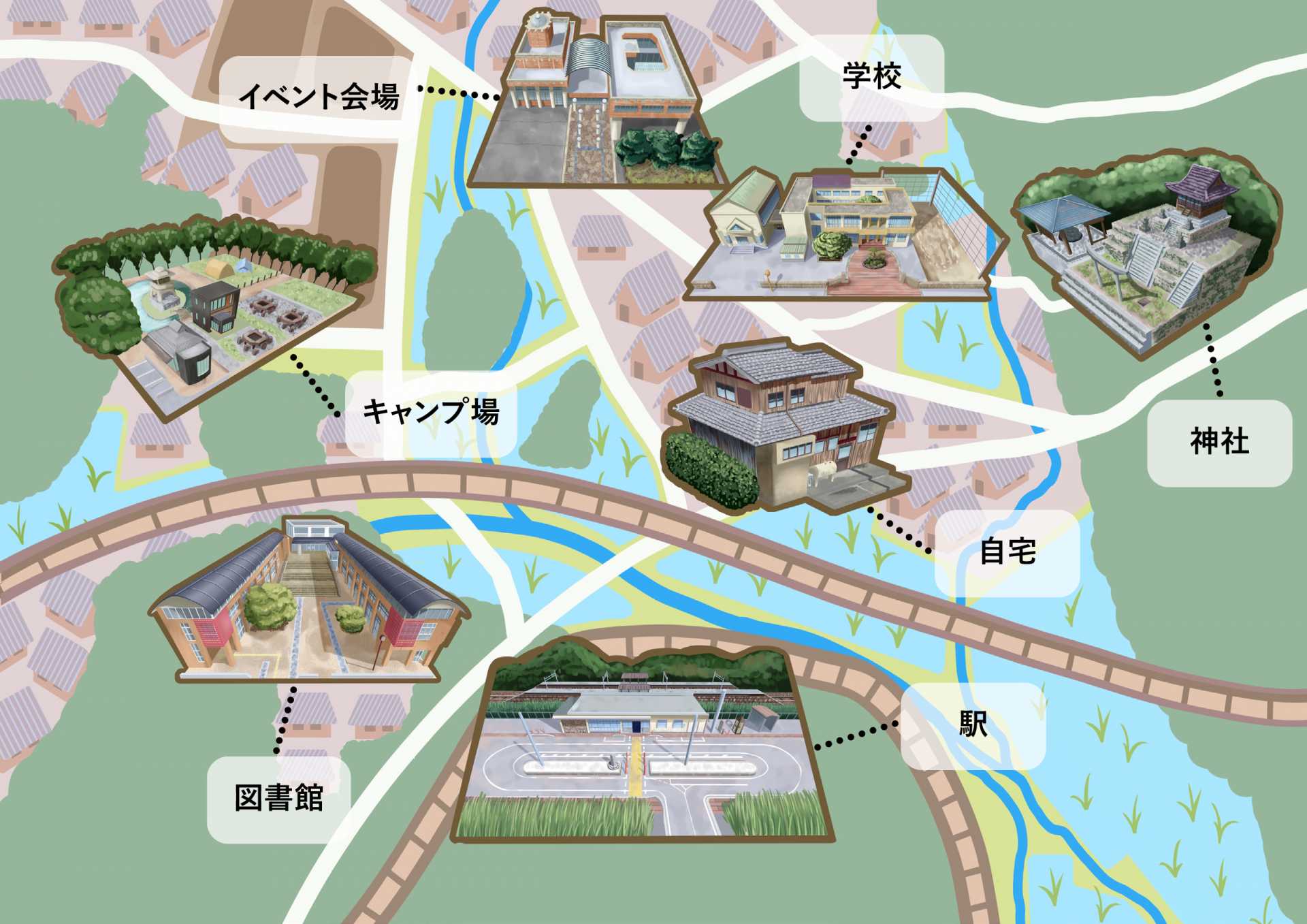このマップと風景画を制作するうえでこだわった点に関して、どのイラストにも植物を取り入れていることにしました。家の前には生垣、大規模な建物の周りには常緑樹が添えてあったりと、場所に応じて違う種類の植物を添えることが自然と共存しているのにふさわしいと思い、それぞれの建物にふさわしい植物を添えるようにしました。マップに取り入れた要素として、伊吹町には伊吹山という山があり、そこから流れる川を田んぼに活用をしているので、マップには川が流れる場所を目立つように配置しています。このように、マップと風景画に自然を関わっているさまを取り入れました。