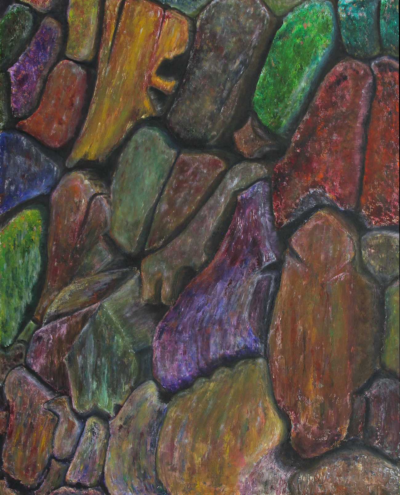 夏に訪れた久能山東照宮の参道を歩いた時、山側に石垣で作られたつづら折りの石垣作りの道がそびえて、背の高い面白い形をした木々と濃い緑の木々に覆われた、自然の回廊の様に見え、山道と石垣に木漏れ日が落ちて、キラキラと光が輝いて緑が生き生きとして、とても美しく感じた。この景色に創作意欲が湧き描く事とした。自然の緑と人工物の石垣、それを引き立てる光と影を主題として、みずみずしく明るい画面に仕上げるべく緑の配色に気をつけて創作した。